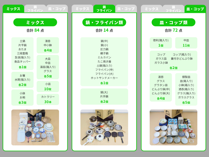 本商品はお客様からの「もう使わなくなったキッチン用品捨てたいけど重たいし、どこに捨てたらいいかわからない・・・」「昔の結婚式でいただいた引き出物捨てるわけにもいかないしどうしよう・・・」というお悩みのお声からキッチン用品に特化したお片付けシリーズを販売開始いたしました。