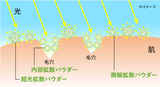 粒子内部で拡散反射することでソフトな光が生まれ、 毛穴などの欠点をソフトフォーカス。