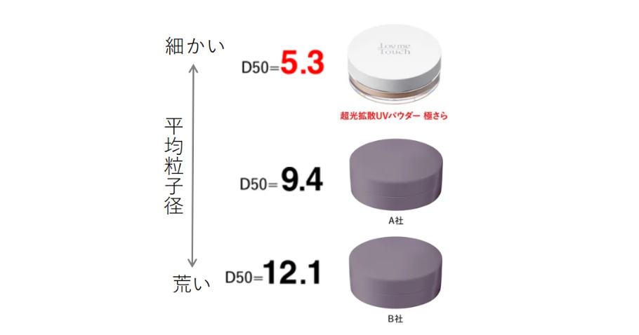 超微粒子だから肌に溶け込むような肌なじみ。粒子同士が固まらず、滑らかに伸び、ムラなく仕上がる。“超光拡散UVパウダー 極さら”は粒子が細かい商品と比較しても、最も粒子が細い結果に。