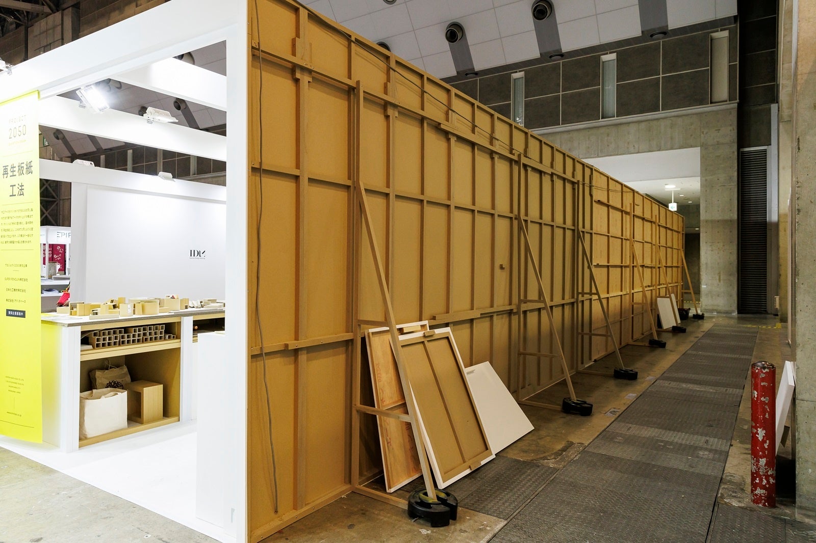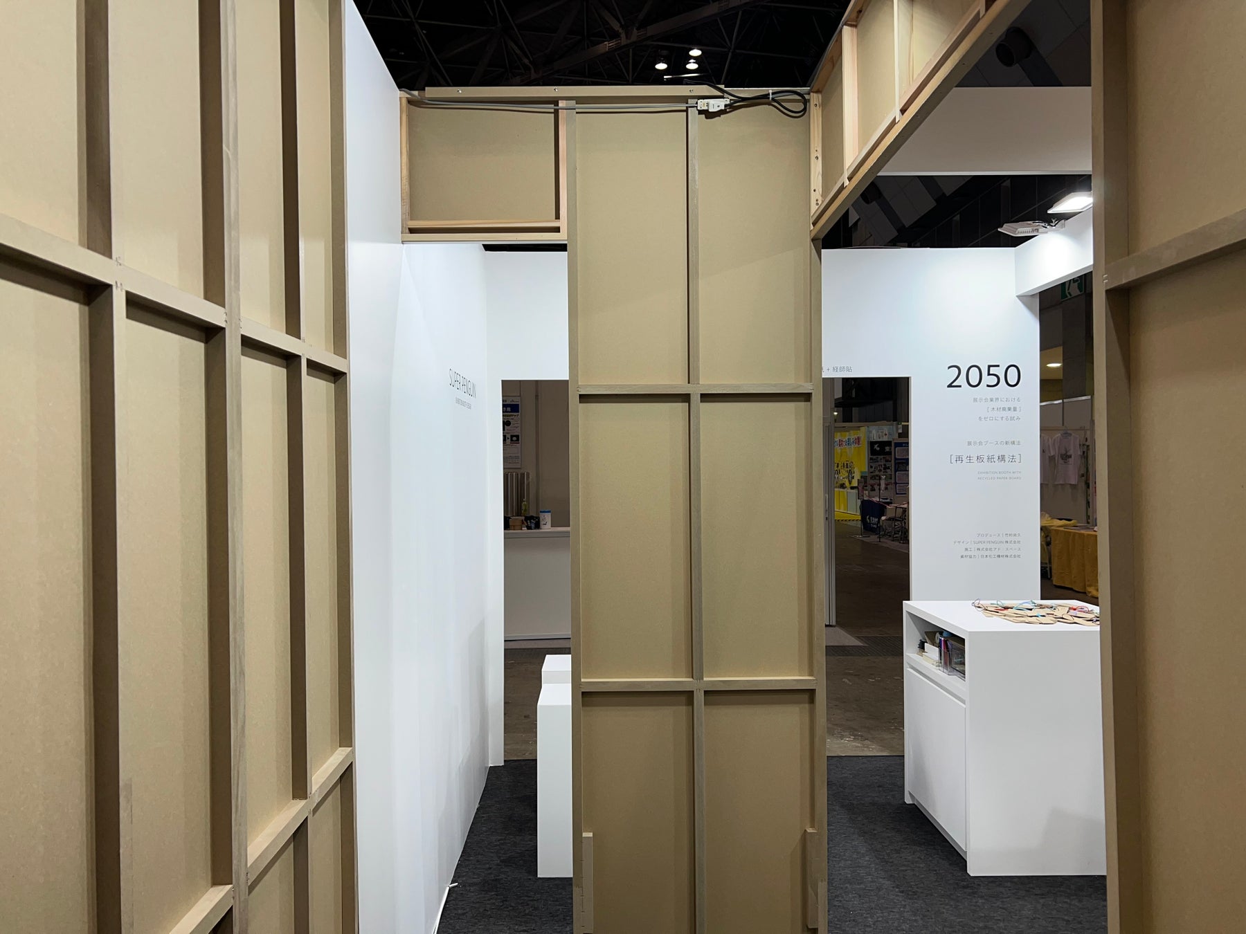 展示会場のブースは、新構法「再生板紙」で製作し、来場者にわかりやすいようにあえて半分壁紙を