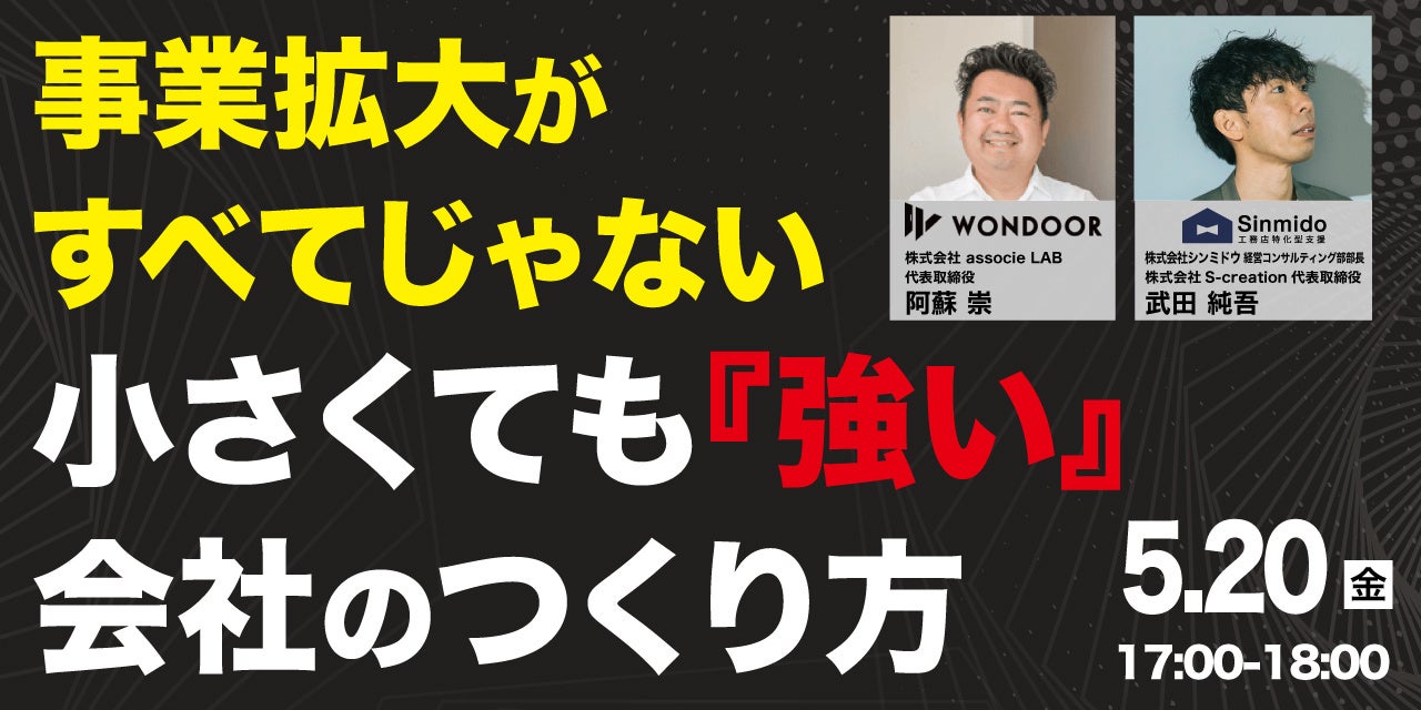 株式会社シンミドウ(本社:埼玉県さいたま市、代表取締役:笹田知弘)と株式会社 associe LAB(本社:愛媛県四国中央市、代表取締役:阿蘇 崇)は、2022年5月20日(金)に、全国の工務店・建築事務所を対象に、【ハウスメーカーに勝ち続ける工務店の考え方とは?】小さくても強い会社のつくり方無料ウェビナーを開催します。