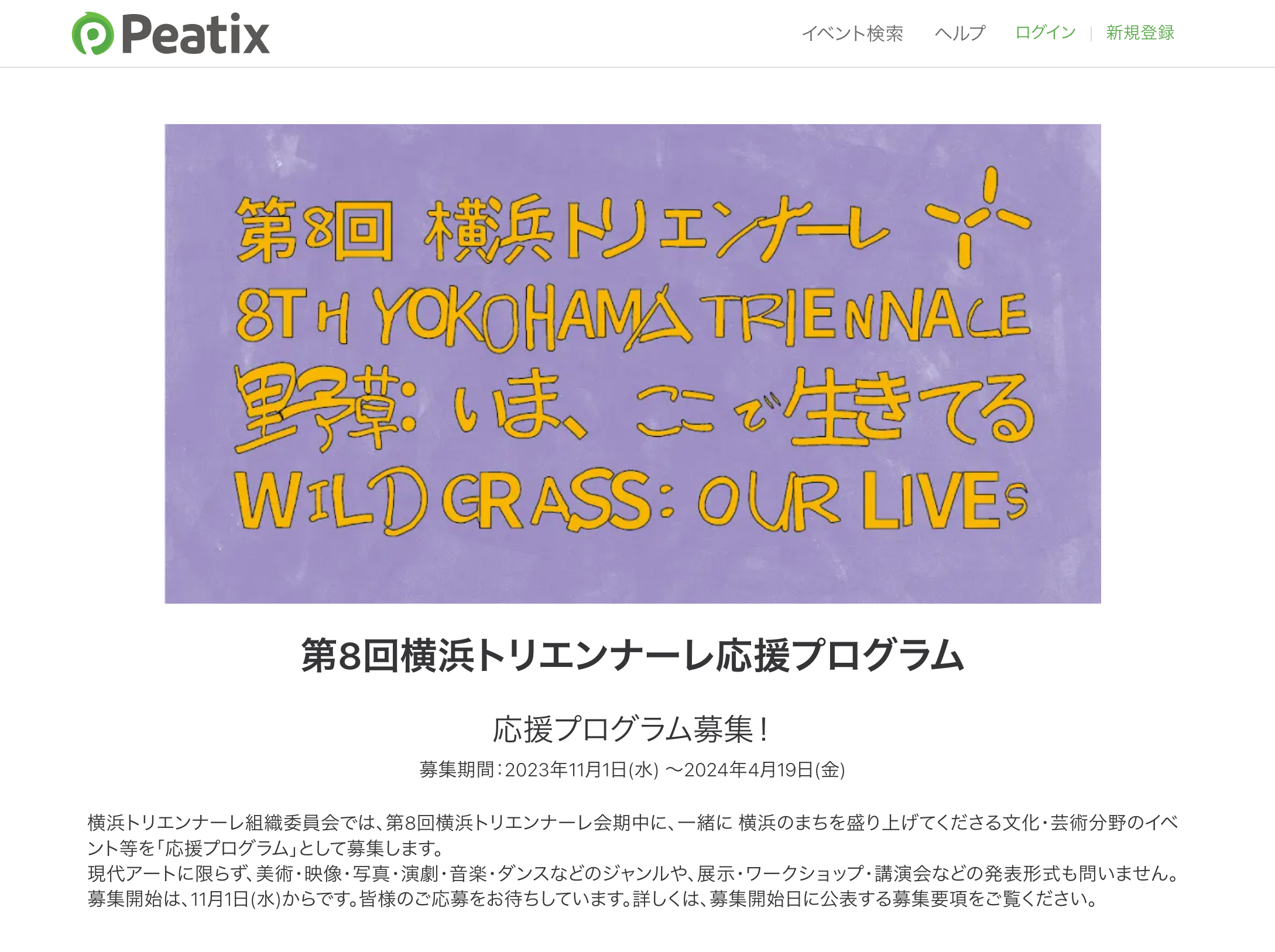 イベント・コミュニティのプラットフォーム・ピーティックス ( Peatix ) を運営するPeatix Inc.(本社:米国ニューヨーク州 CEO:原田 卓 )は、横浜トリエンナーレ組織委員会他が主催する「第8回横浜トリエンナーレ」の趣旨に賛同し、同展覧会の会期中に市民団体や企業などが実施する文化・芸術イベント(応援プログラム)の告知・PRを支援いたします。また、「応援プログラム」の主催団体へ向けたピーティックス利用説明会の開催、ピーティックス利用手数料の特別割引を実施いたします。