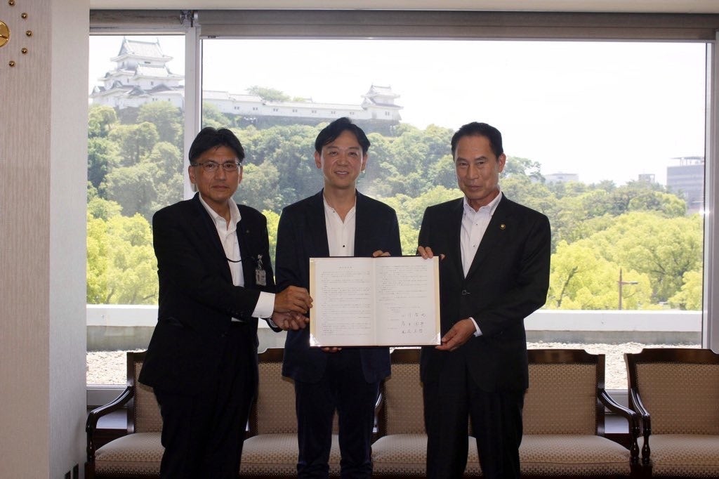 左から、和歌山県 商工労働部長 大川伸也、MRT 株式会社 代表取締役 小川智也、和歌山市長 尾花正啓