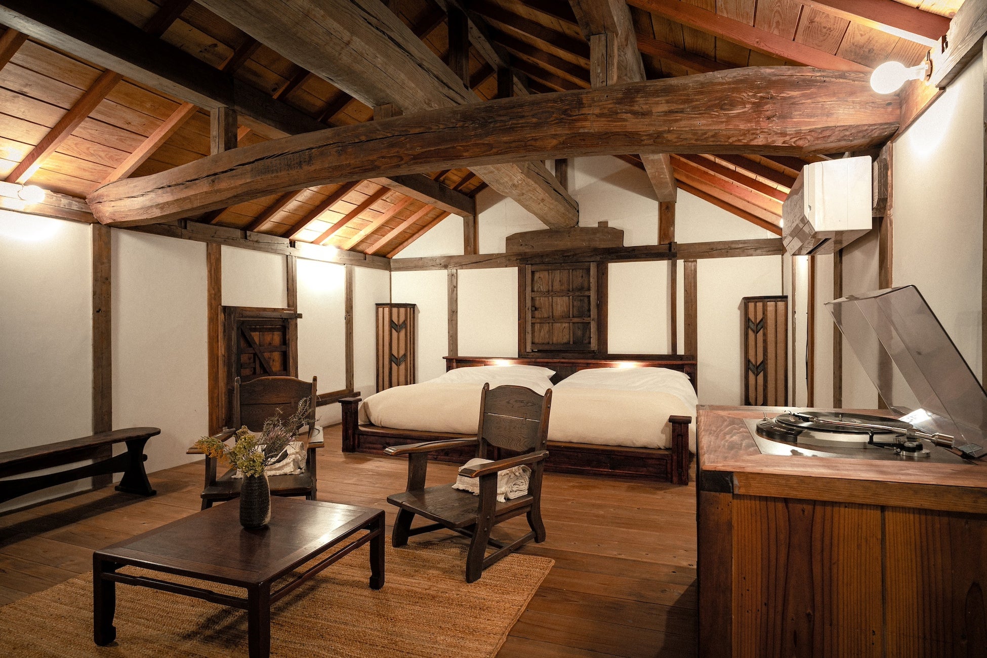 2階立ての66㎡と落ち着いた空間で、「音にひたる」がコンセプトの客室。1階はダイニングとバスルーム、2階にはリビングとベッドルームでコンパクトながらも快適に過ごせる造り。プロジェクターでの映画鑑賞やレコード鑑賞などお楽しみいただけます。