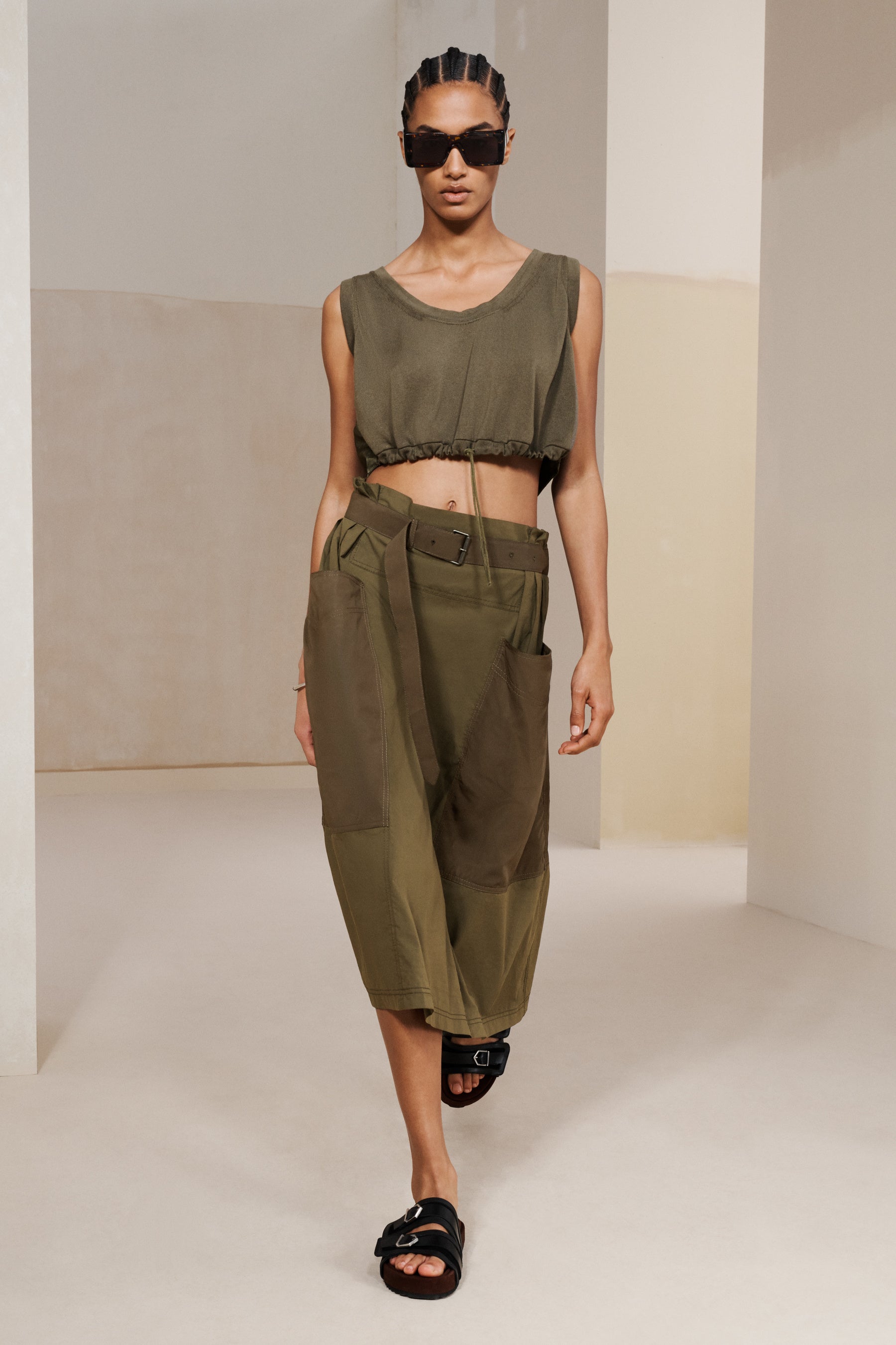 ■スタイリング: シンプル且つ機能性に優れたリブニットタンクトップとカーキ色のプリーツスカートのスタイリング