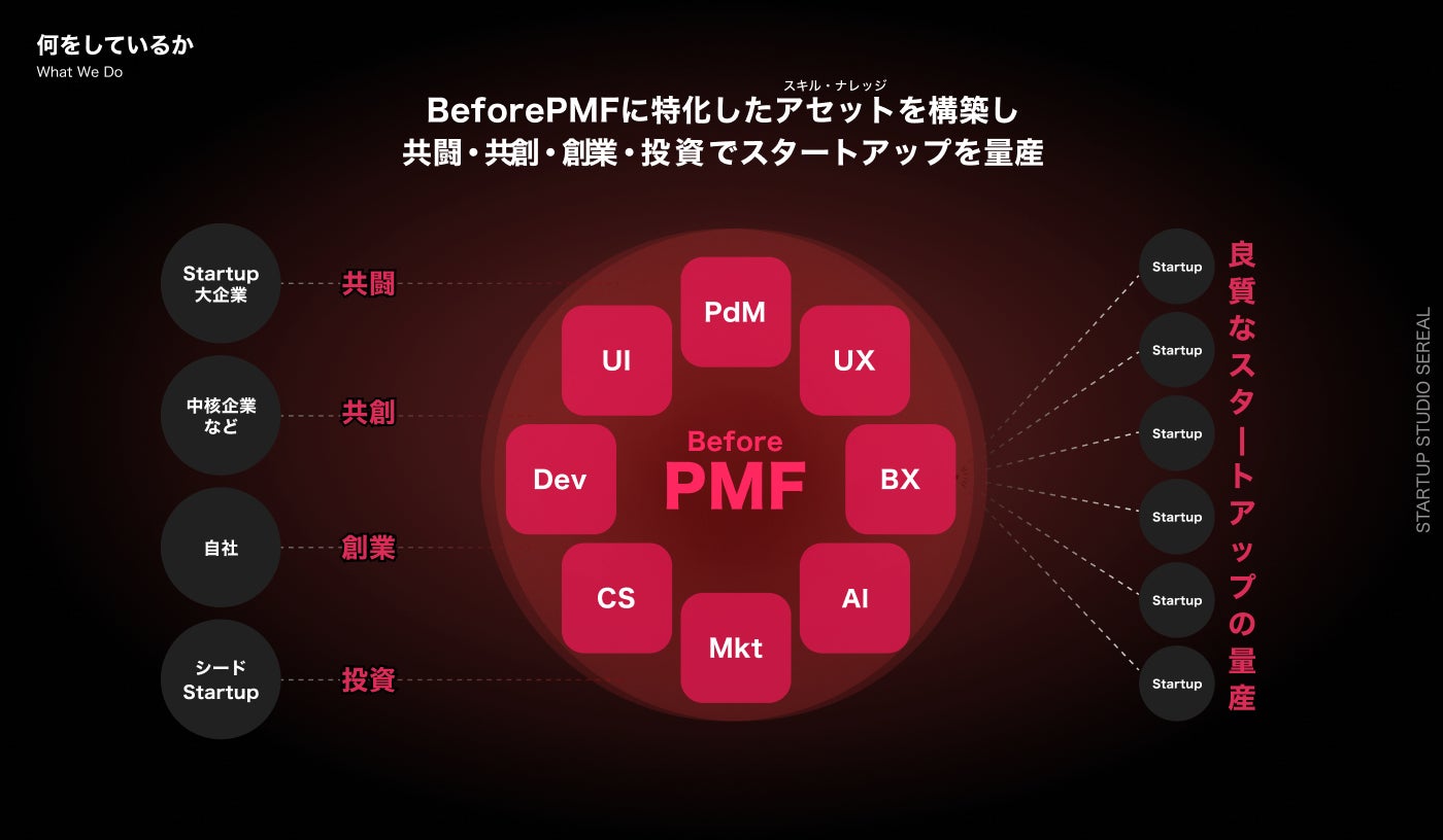 PMF(立ち上げからPMFまでの01フェーズ)に特化した事業・プロダクト・マーケティングのエキスパートが、「共闘」「共創」「創業」「投資」で良質なスタートアップを量産するスタートアップスタジオです。