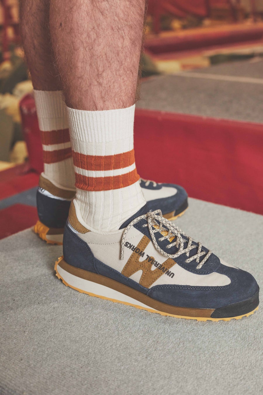 Future Friendship ProjectはPeace,Love and SoulというUniversal Worksの信念に共感するブランドと繋がり、一緒に仕事をする活動です。このコラボレーションは、KARHUの魅力を最大限に引き出すもので、KARHUの歴史を尊重し、KARHUとUniversal Worksの素晴らしいパートナーシップを表現しています。今回のコラボレーションではアクティブなアイテムにUniversal Worksならではの英国の伝統的な要素を組み合わせ、新しいシルエットを完成させました。 KARHUのコレクションの中から選んだ2つのモデル「Mestari Control」と「Trampas」を再構築し、上質なスエードとナイロン素材を採用しています。KARHUのアイコンであるMロゴが随所に施されていますが、Universal Worksの「W」にちなみMを反転させています。Mの由来は、フィンランド語で「チャンピオン」を意味する「Mestari」からきています。