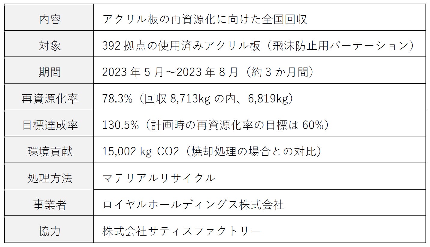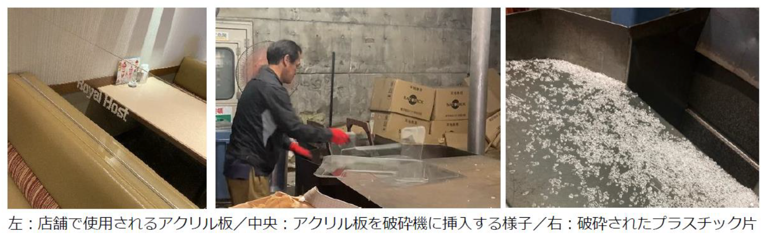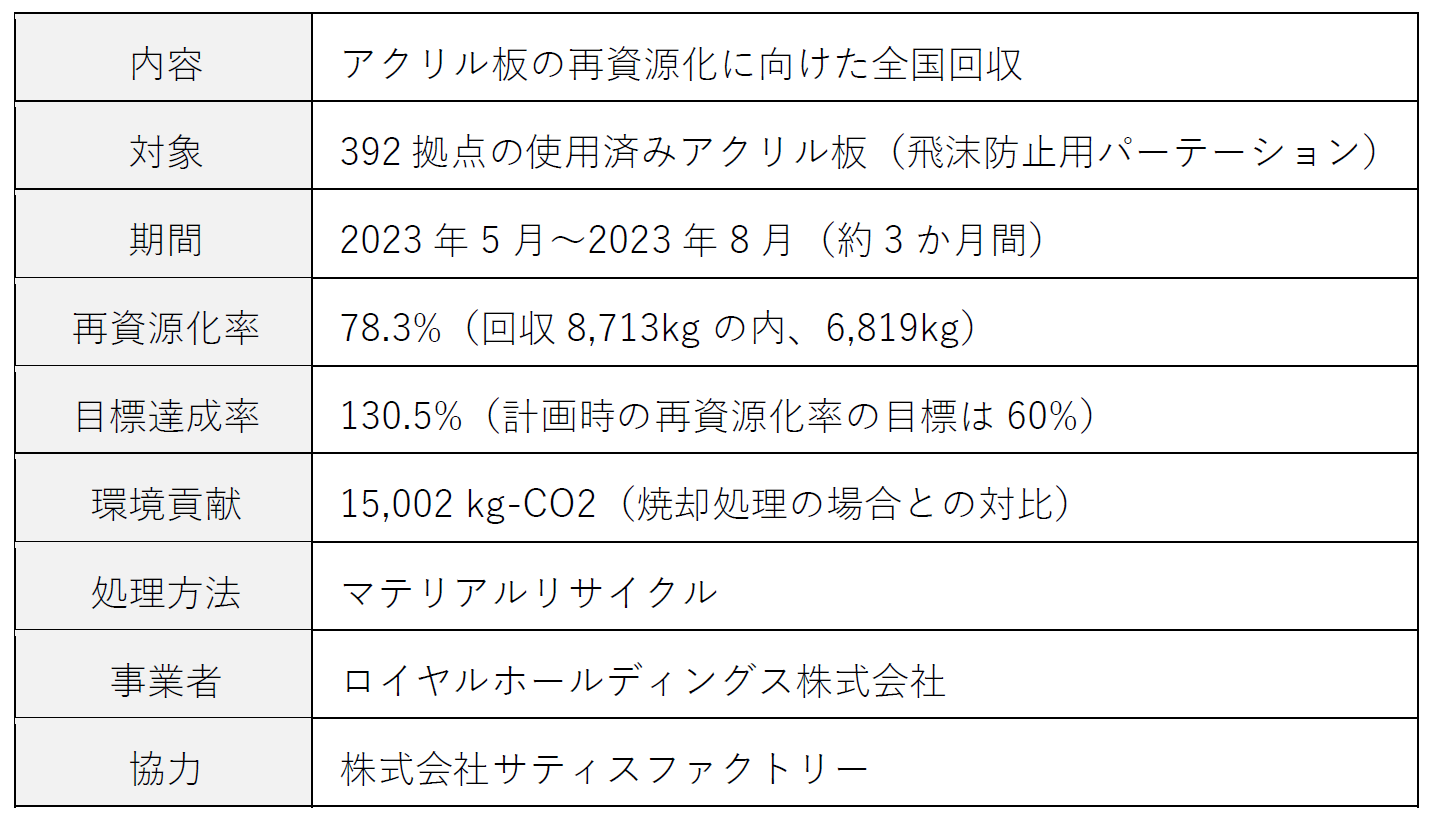 ロイヤルグループは、外食事業等を核に全国に店舗展開し、これまでも食品ロス削減をはじめ、環境対策に積極的に取り組まれてきました。その中で、さらなる環境負荷低減に向けて、店舗で使用されたアクリル板の再資源化を開始。これによるCO2排出削減は15トンにのぼり、杉の木1,700本が1年間に吸収するCO2量に相当する成果を得ました。
