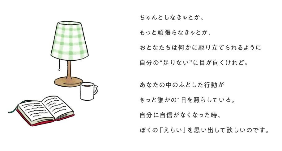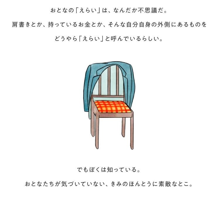 小さい頃、些細なことでも「えらいね。」という言葉を周りの大人にかけてもらった記憶がある人も多いのではないしょうか。でもいつの間にかその言葉は、権力やお金をもっている一部の人にしか届かないものになっていってしまいます。大人になるにつれ、肩書きや資産で評価をし、自分の外側にある何かに自分の価値を委ねてしまう…。けれど、どんな人にも、人それぞれ形の違う「えらい」がその人自身の中にあるはず。ほんの些細なことだって、一生懸命生きることだって、本当はとてもえらいこと。
