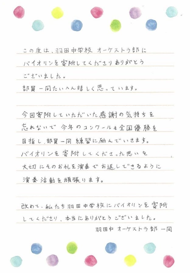 通常のふるさと納税と違い、本制度には「返礼品」と呼ばれるものがなく、児童・生徒たちからの「感謝の手紙」や演奏会へのご招待等が届きます。返礼品目的ではなく純粋に応援する想いから生まれる楽器寄附は「ふるさと納税の本質を捉えた制度」として、2020年度には「総務省ふるさとづくり大賞 地方自治体表彰」もいただきました。