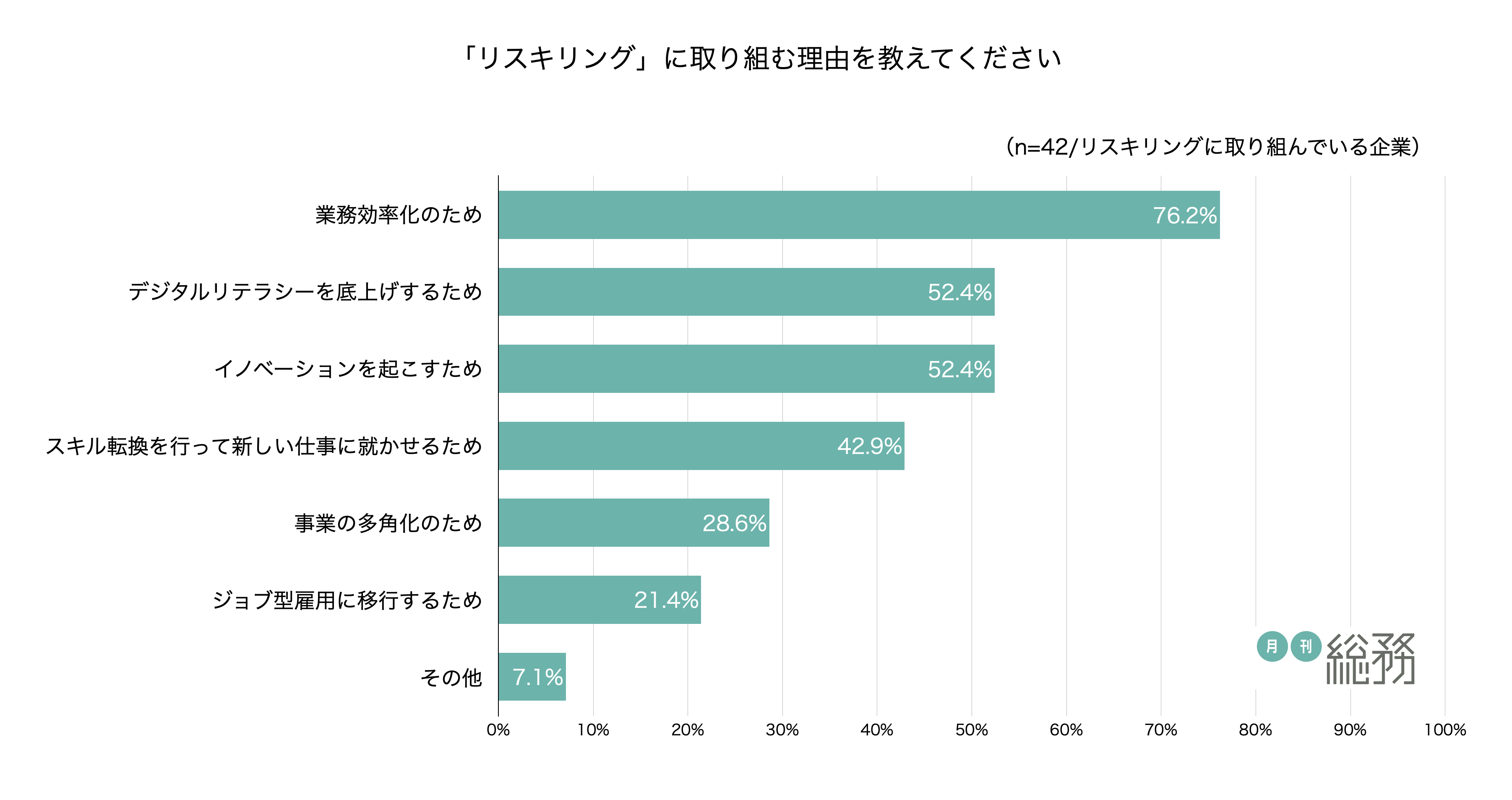 - リスキリングに取り組む理由は「業務効率化」「デジタルリテラシーの底上げ」「イノベーション創出」など