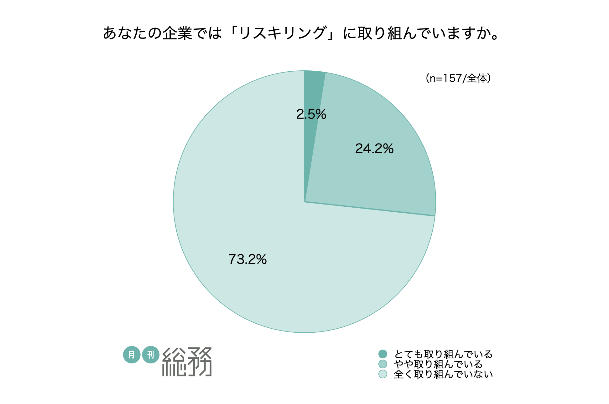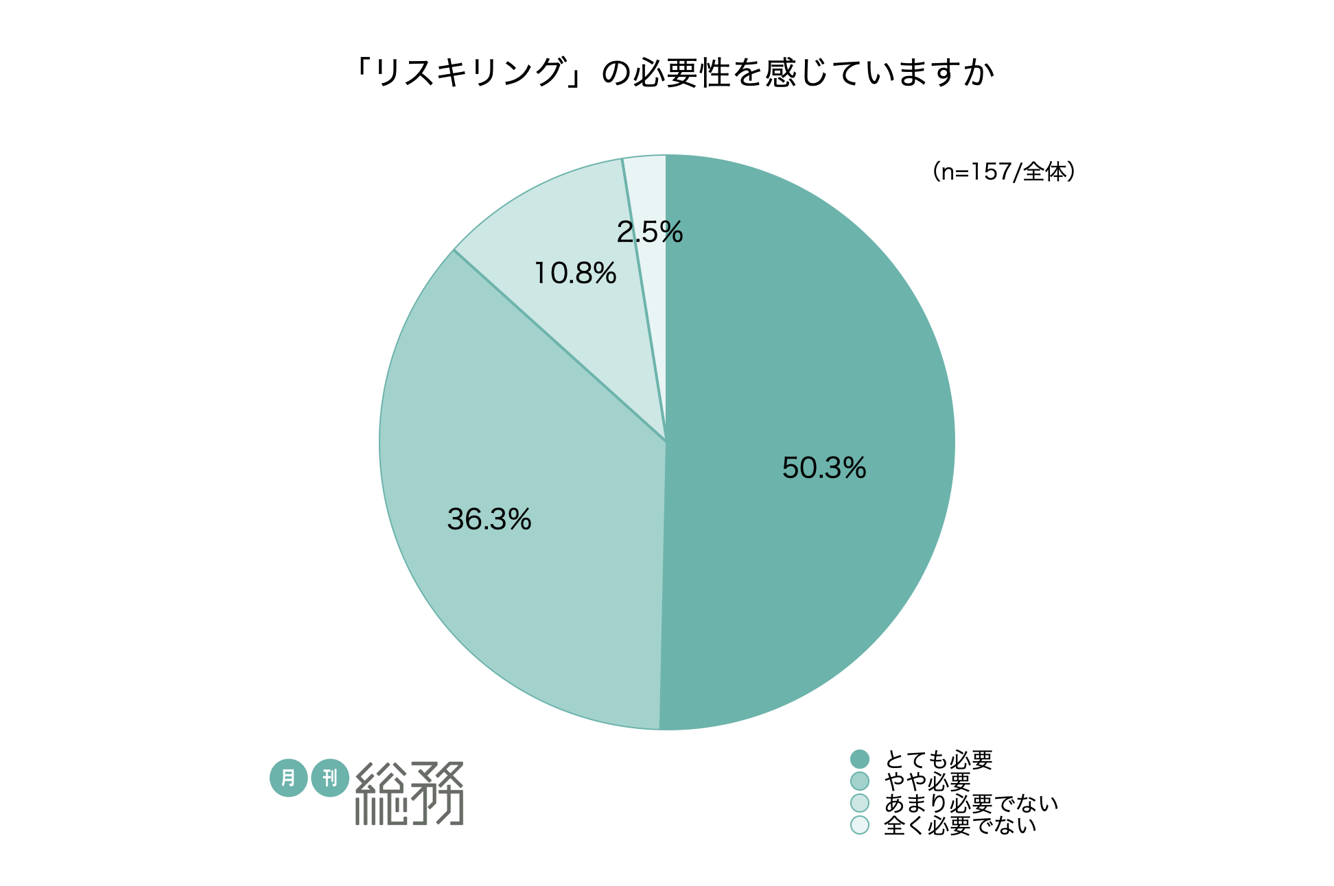 日本で唯一の総務専門誌『月刊総務』を発行する株式会社月刊総務(所在地:東京都千代田区、代表取締役:豊田健一)は、全国の総務担当者を対象に「リスキリングに関する調査」を実施し、157名から回答を得ました。