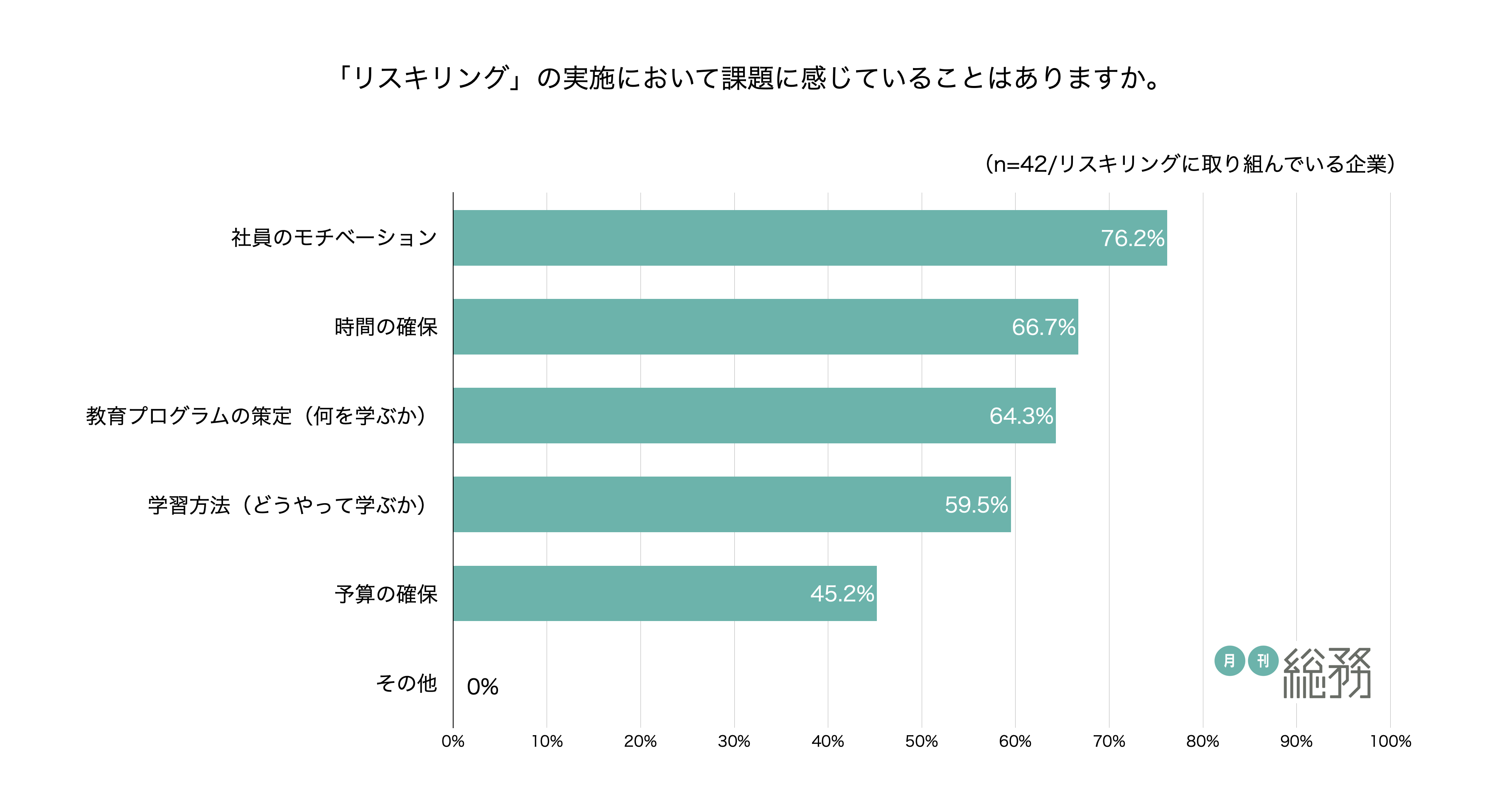 - リスキリング実施の課題は「社員のモチベーション」「時間の確保」「教育プログラムの策定」など