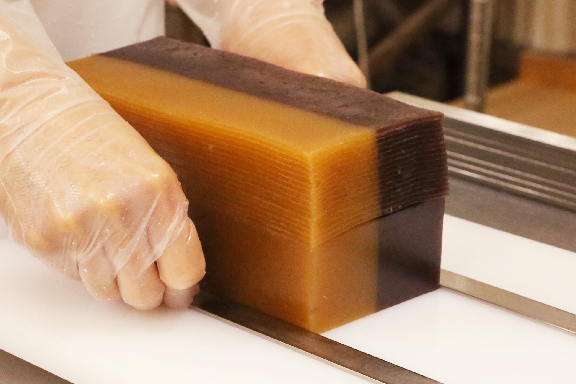 なんと、1枚1枚職⼈が⼿作業でスライスしている羊羹は、厚みにもこだわりました。試作を重ね辿り着いたのは「2.5mm」という厚さ。その厚さが最も⼩⾖の⾵味を感じられ、パンとも馴染みがよく最後まで美味しく召し上がっていただけるという結論に。