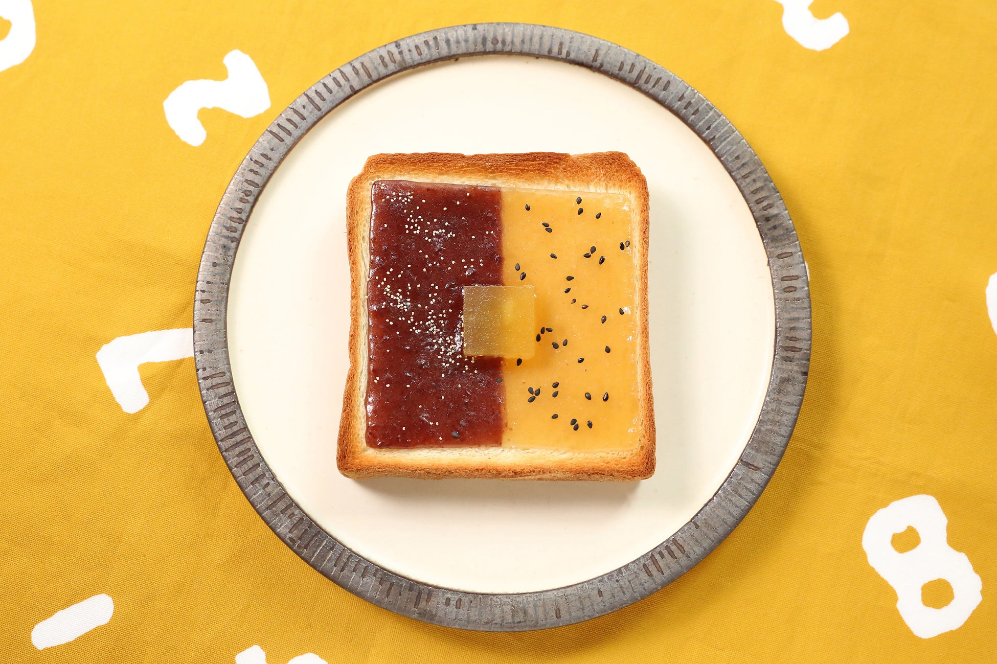 その⼈気の理由は、自宅で簡単に食べられる⼿軽さと、創業220余年以上の和菓⼦屋のこだわり。最⾼級と⾔われる「丹波⼤納⾔⼩⾖」を使⽤し、スライスは全て職人の手作業。沖縄の塩入りのバター羊羹を乗せ、アクセントにケシの実をたっぷりあしらいました。