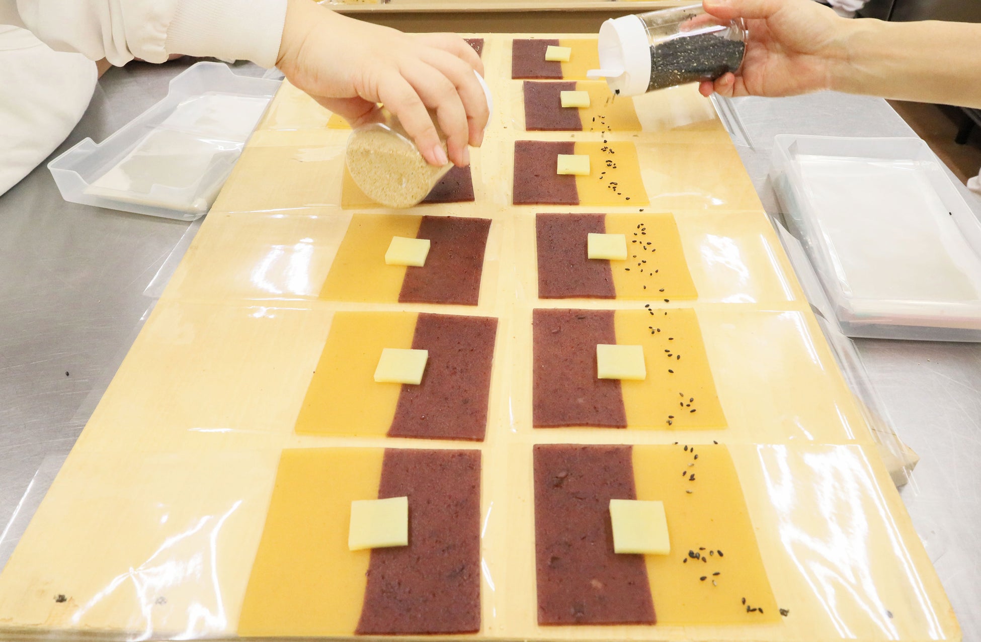 そして、小倉ようかんにはケシの実を、焼き芋ようかんには黒ごまをたっぷりとトッピングして食感と香りをプラス。更に沖縄の塩の効いた焦がしバター羊羹を合わせることで、より風味のある一品が完成しました。