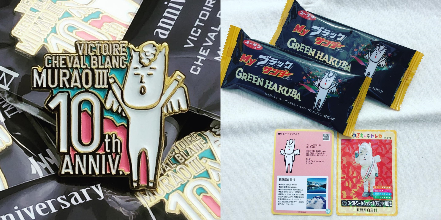 期間中に道の駅白馬で購入いただいた方には、10周年記念ピンバッチと村男のオリジナルお菓子(共に非売品)をプレゼント!