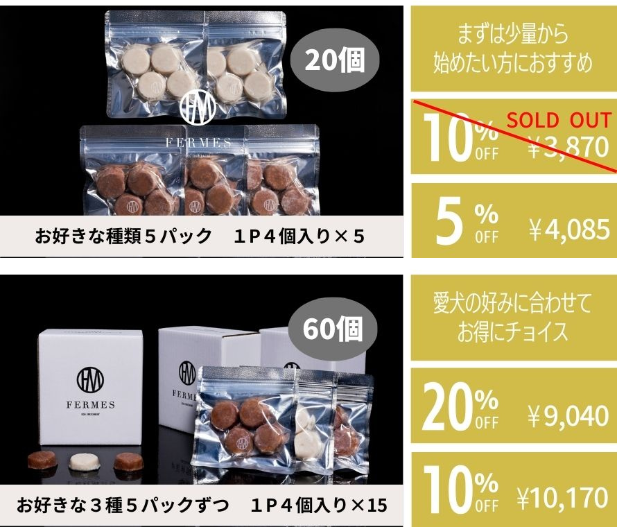 FERMESの商品は全9種類。原材料はシンプルな構成なので、手軽に始めることができます。形状は冷凍のタブレット状で1個は約15gです。FERMES は少ない分量で素材の良さを発揮できるので、究極のヒューマングレードを追求しても1日当たりの費用がリーズナブル。それだけでなく、愛犬の体調に合わせて予算を抑えた使い方もできるのが嬉しいポイントです。