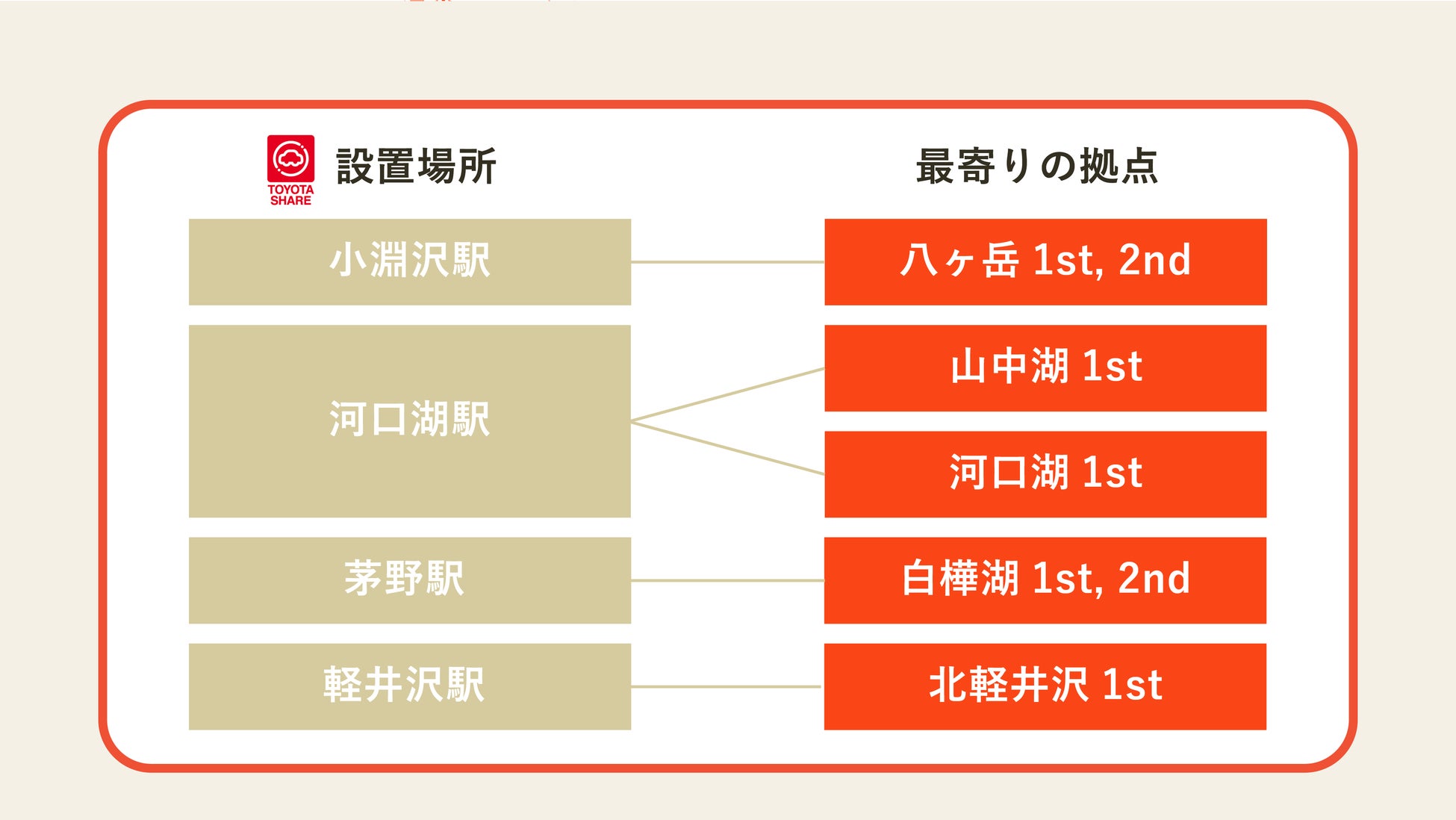 2)カーシェア設置場所 : 小淵沢駅(八ヶ岳1st/2nd)、河口湖駅(山中湖1st/河口湖1st)、茅野駅(白樺湖1st/2nd)、軽井沢駅(北軽井沢1st)