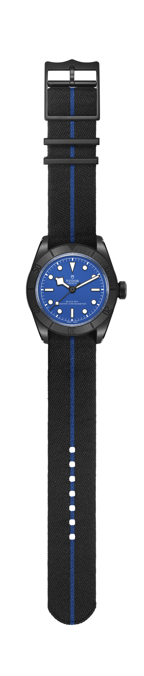 ブラックファブリックストラップ(ブルーのライン入り)/ブラックPVDコーティングの316Lスチール製バックルが付属