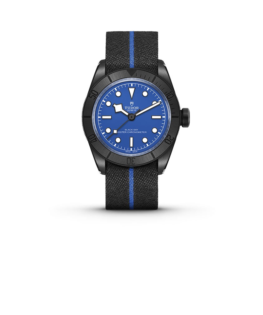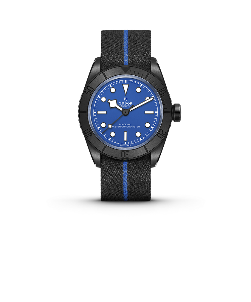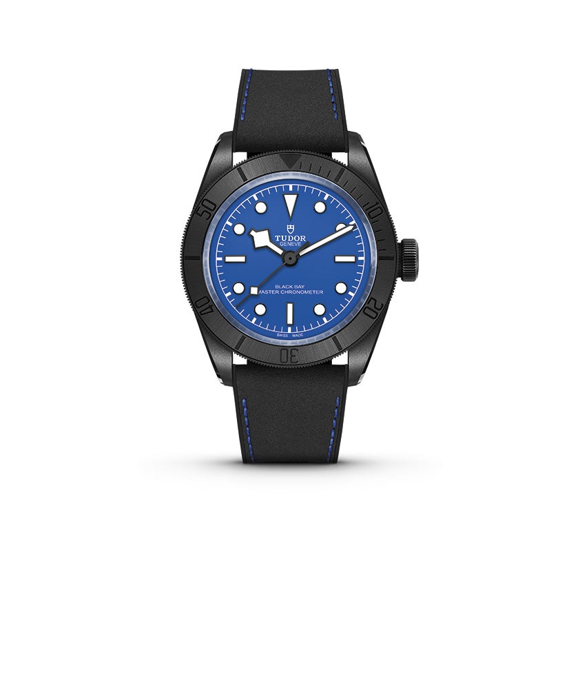 先端技術を彷彿させるコンテンポラリーなディテールと、チューダーが重んじるヘリテージを慎ましやかに表現した要素が融合するブラックベイ セラミック “ブルー”の外観。モノブロック構造のブラックセラミック製ケースの表面はサンドブラスト仕上げ、面取りされた斜面はポリッシュ仕上げとすることで、際立つコントラストと明瞭なラインが生まれている。回転ベゼルのインサートには、サンレイサテン仕上げのブラックセラミックを採用。そこに刻まれた同系色の目盛りは光に応じて繊細に変化し、マットな質感を引き立てる。レザーにラバーライニングを合わせたブラックのハイブリッドストラップの内側には「スノーフレーク」モチーフを採用し、ブルーのスティッチとブラックPVDコーティングのステンレススチール製フォールディングクラスプ、そして付属のブルーのライン入りブラックファブリックストラップによってこのモデルの外観が完成する。