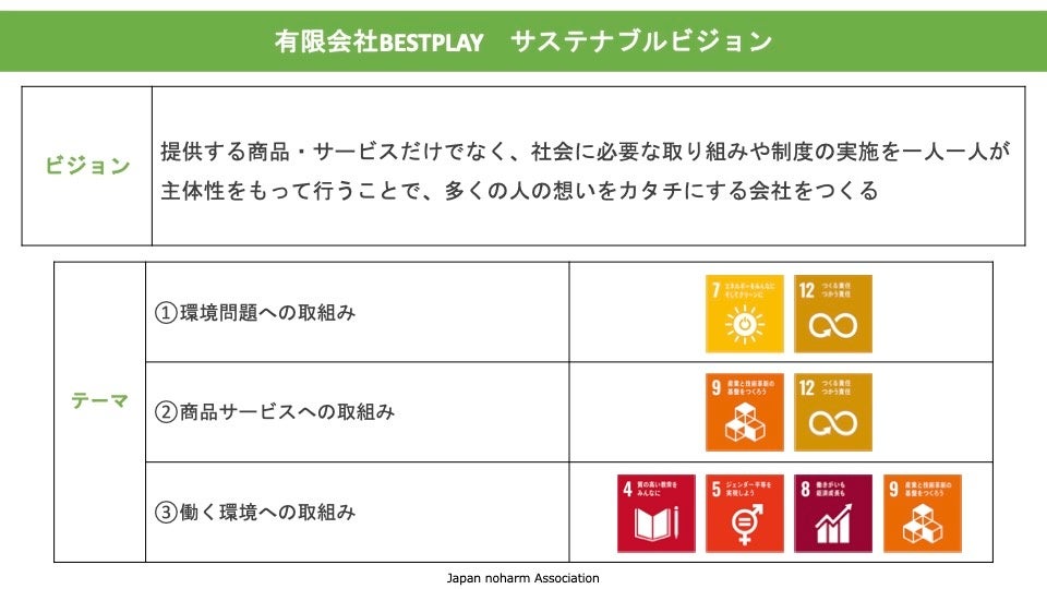 有限会社BEST PLAY ( 所在地:京都市 代表取締役:吉田由美 )は、SDGsに取り組む企業を対象としたサステナブル経営支援サービスを提供する一般社団法人日本ノハム協会( 代表理事:神田尚子 ) とメンバーシップを締結し、「環境」「商品サービス」「働く職場」をテーマにサステナブルビジョンを掲げ取り組んでいます。