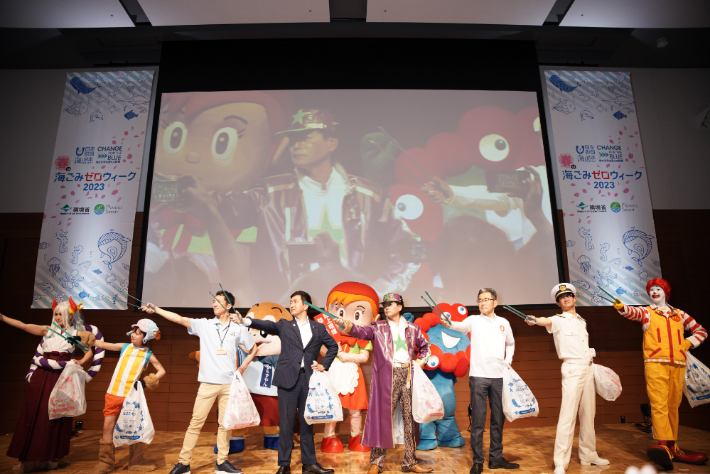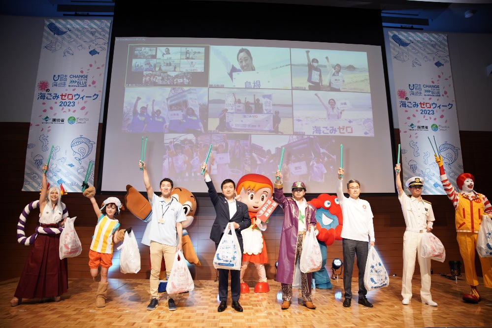 開会式ではイベント協力として参加された海上保安庁・日本マクドナルド株式会社と、コスプレイヤーの3チームが「UMIGOMI-ZERO宣言(海ごみゼロ宣言)」と称して海ごみを減らす意気込みを表明。また、同時刻に「海ごみゼロウィーク」をキックオフする全国8会場(北海道、岩手、富山、愛知、島根、岡山、長崎、沖縄)とも中継を繋げて海ごみゼロウィークに懸ける想いを発表してもらい、全国一丸となって「春の海ごみゼロウィーク2023」の開始を盛り上げました。