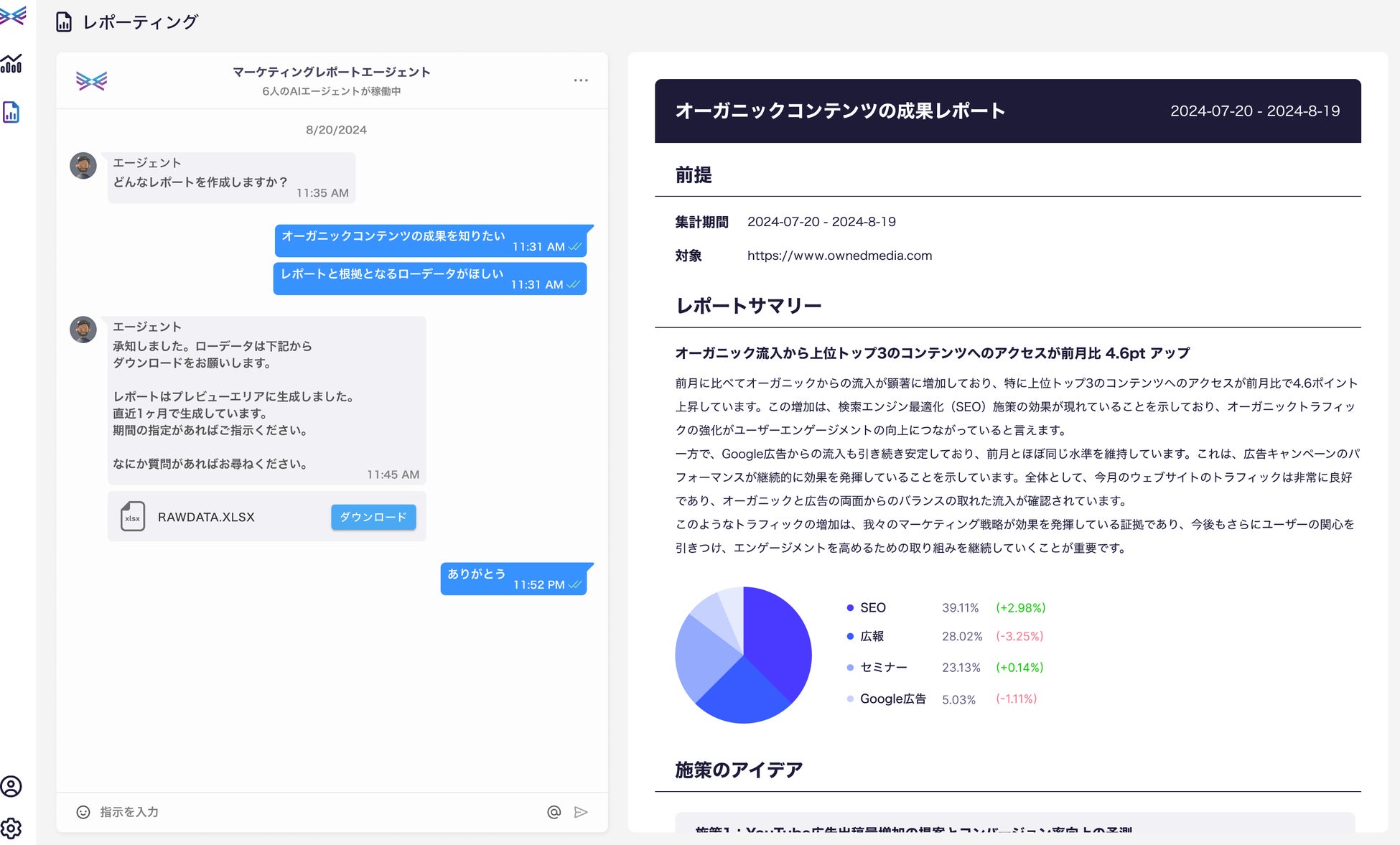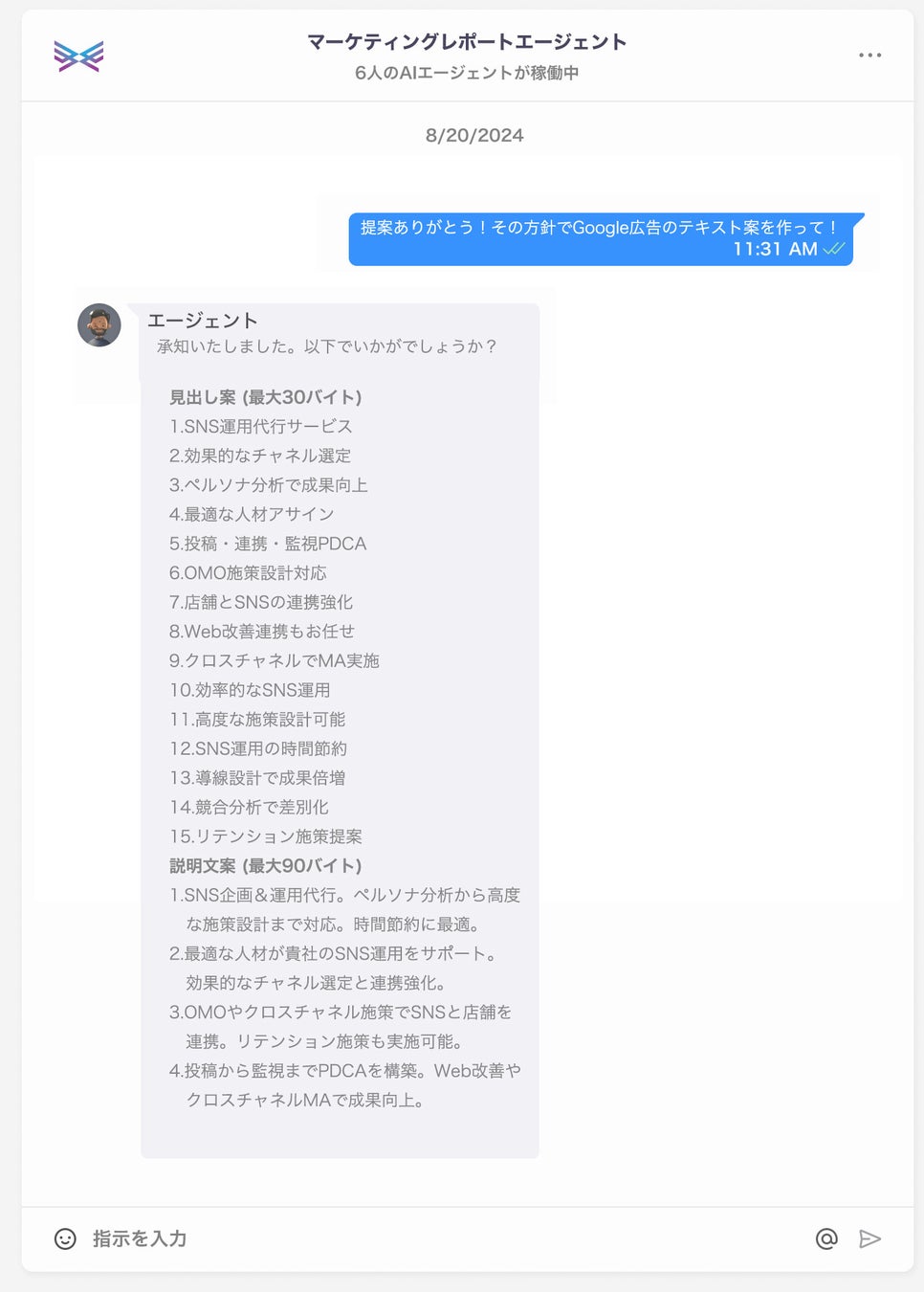 そのレポートや提案と共に会話がなされ、各種のジェネレーティブまでをAIが実施いたします。生成できる対象は、画像・文書一式となります。また開発を進めた後はオーディエンス修正や生成までを可能にすることも視野に入れています。