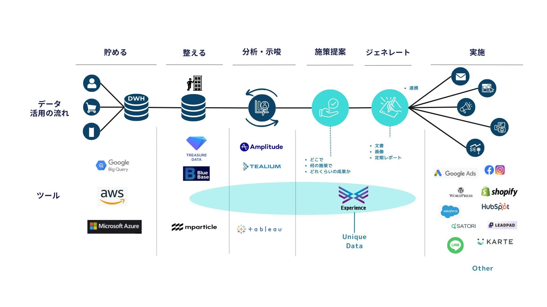 提案された対象を、広告ツール・MA/CRMツール・Wordpressなどのアクションツールと連携することにより、ワンクリックで実装までが可能になる仕様です。