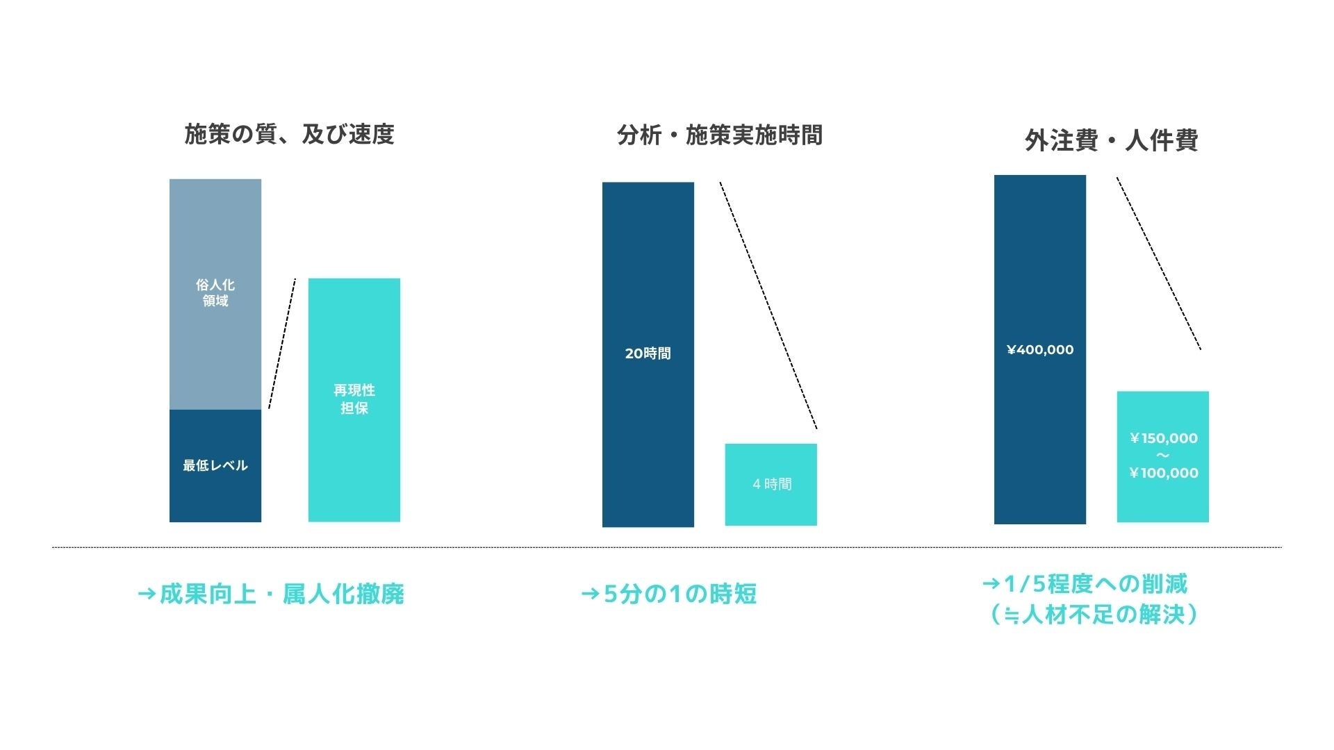 施策が想定から外れたので止めるべきか、もしくは想定以上の成果でさらに加速すべきかが明確化され、工数削減と共にPDCA迅速化に寄与します。