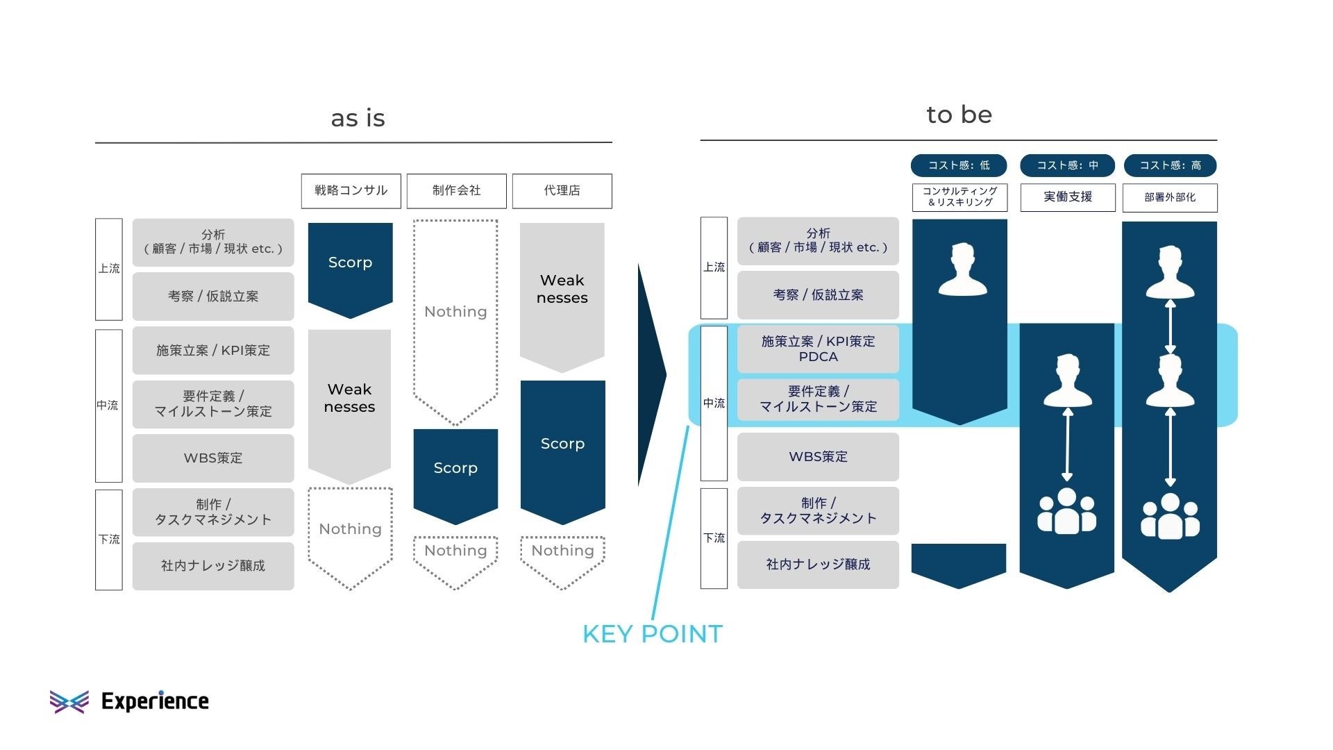状況分析・棚卸しから逆算したKPIや施策策定をします。またその後のプロジェクトマネジメントやディレクションなどの実行支援、もしくはエンドクライアントに対してのリスキリングを実施となります。