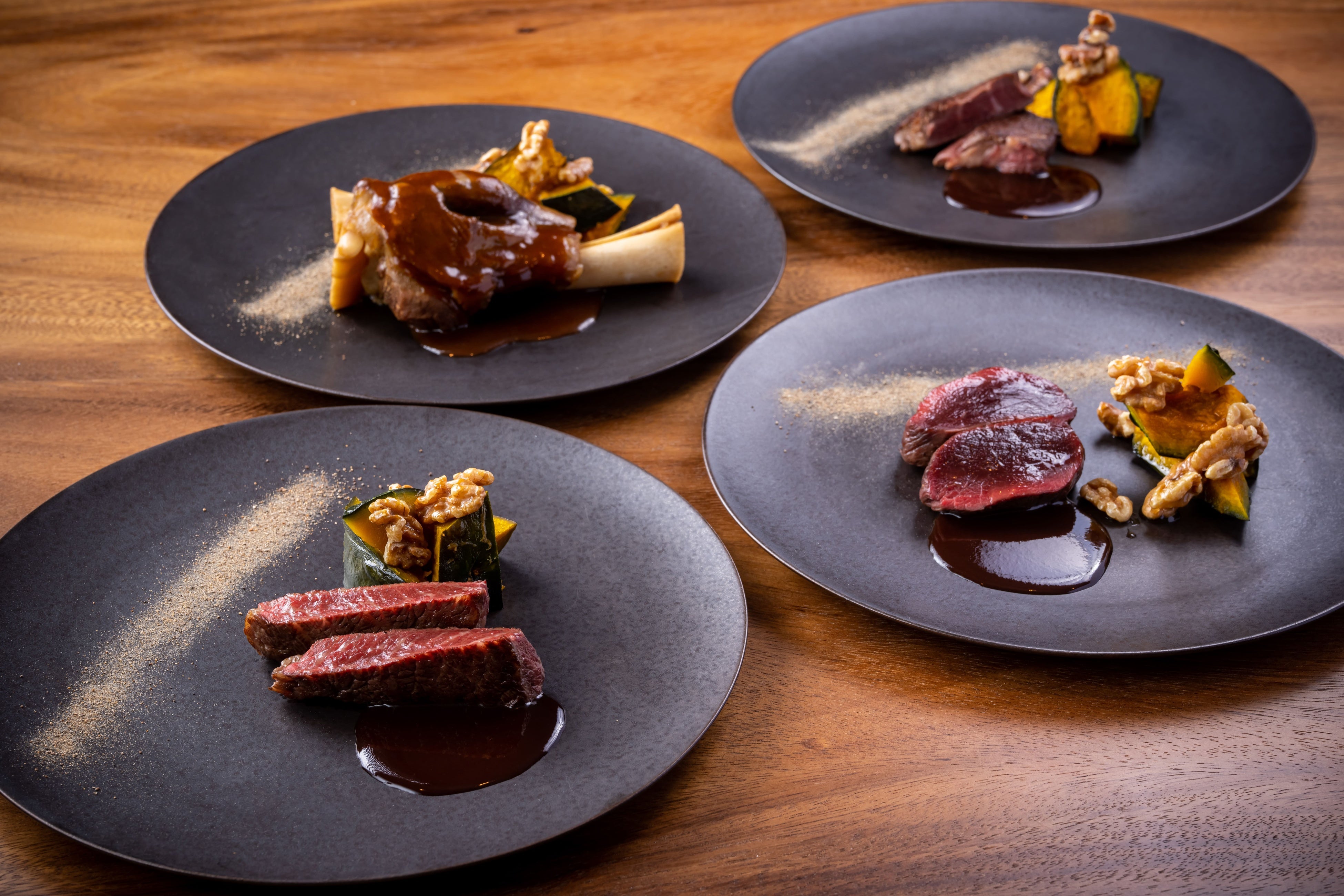 伝統的な信州の秋をイメージしたボタニカコース -Autumn 2022- はスターター5品、お肉料理4品、お魚料理4品などからお好みのお料理をお選びいただけます。お肉料理からは「信州アルプス牛イチボ肉の炭火焼」、「信州アルプス牛フィレ肉の炭火焼」、「信州産鹿ロース」、「ラムシャンク(子羊すね肉の煮込み)」を。スープは「ココナッツ風味のスパイシーパンプキンスープ」、「ミネストローネ」、「信州産キノコと福味鶏のスープ パイ包み焼き」、「オニオングラタンスープ」の4種類からお選びいただけます。