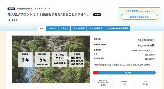 JR青梅線沿線「沿線まるごとホテル」第2弾宿泊施設ファンドが募集金額約1億円を達成