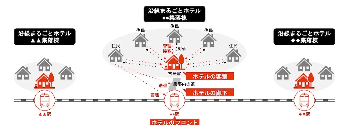 「沿線まるごとホテル」は、駅とその周辺の集落に点在する地域資源を”編集”し、地域全体を”一つのホテル”に見立てる世界観をつくりだす地域活性化プロジェクトです。