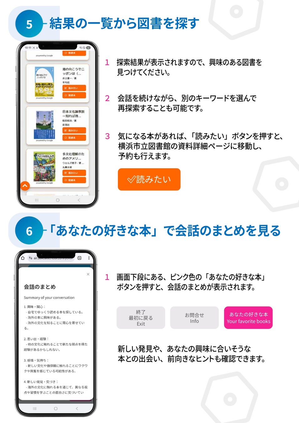 後半では、音声対話AI を用いたサービス「AI とお話ししながら本を探す」の体験を行い、横浜市立図書館での新しい本との出会い方を紹介します。