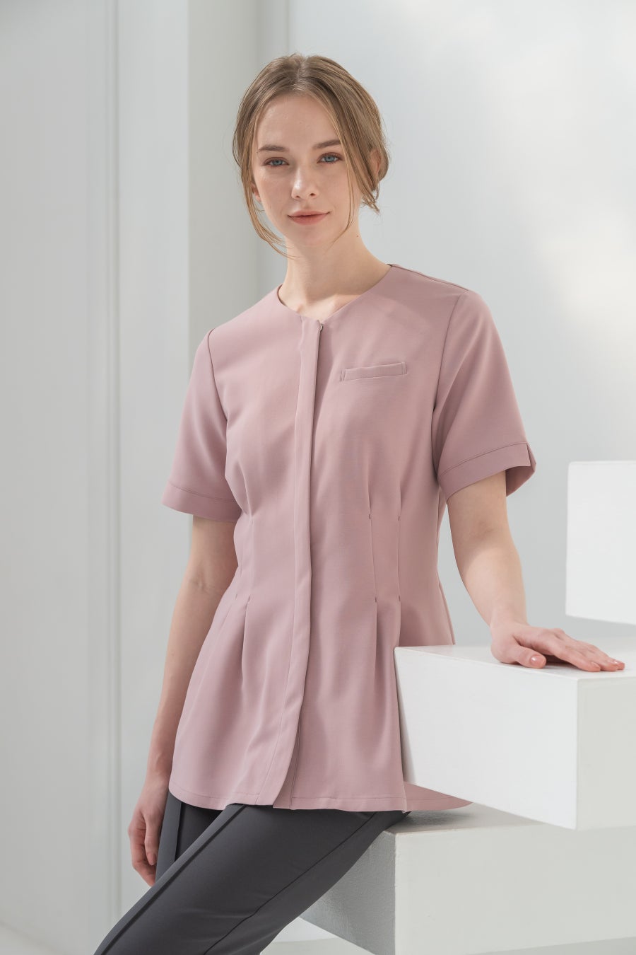 美しいラインを作り出すトレンド感のあるタックのデザインと、前開き仕様で着脱のラクさも叶えた一番人気のスクラブ。