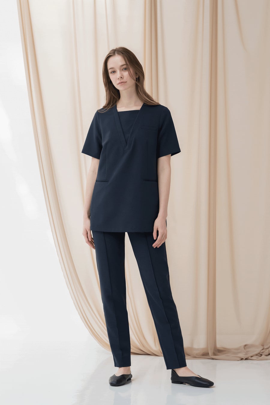 ウエストの高い位置に切り替えを入れることでスタイルアップを狙った、ほんのりフェミニンな印象のスクラブ。腰回りをカバーできる安心の丈感です。