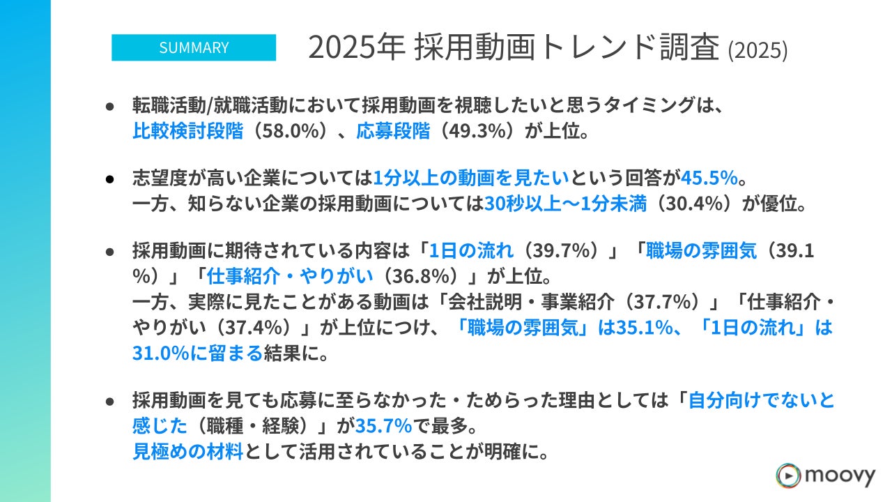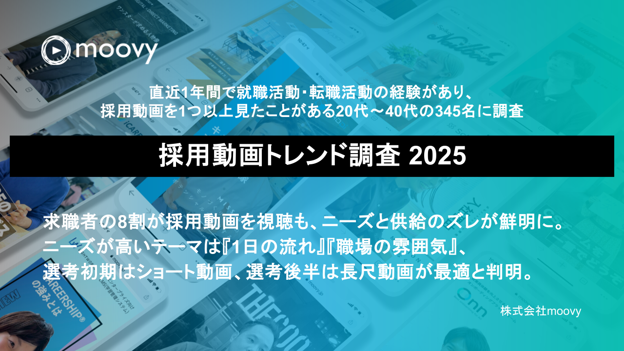採用動画の制作・配信サービス『moovy+』を提供する株式会社moovy(本社:東京都渋谷区、代表取締役:三嶋 弘哉)は、直近1年間で就職・転職した20代から40代の345名を対象に、採用動画のトレンドに関するアンケート調査を実施しました。その結果の一部を抜粋し、お知らせいたします。