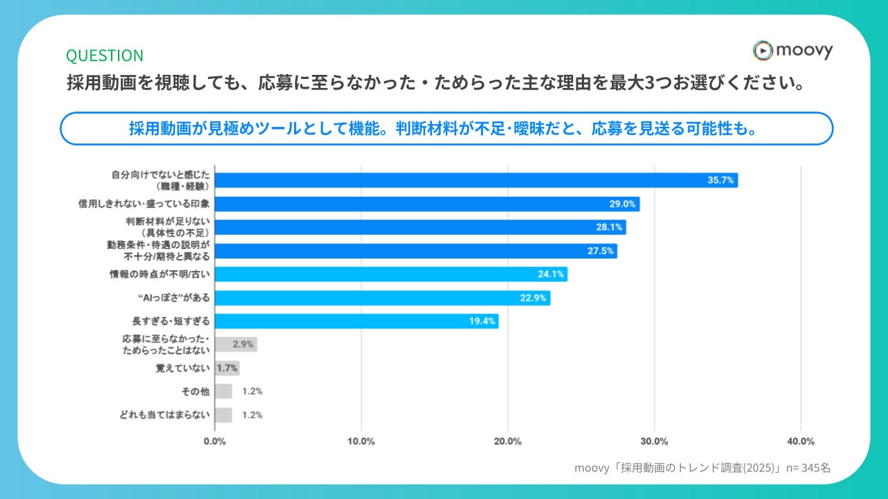 採用動画を視聴しても、応募に至らなかった・ためらった主な理由については、「自分向けでないと感じた(35.7%)」、「信用しきれない・盛っている印象(29.0%)」、「判断材料が足りない(28.1%)」が上位3位となりました。一方、「応募に至らなかった・ためらったことはない」は2.9%に留まりました。