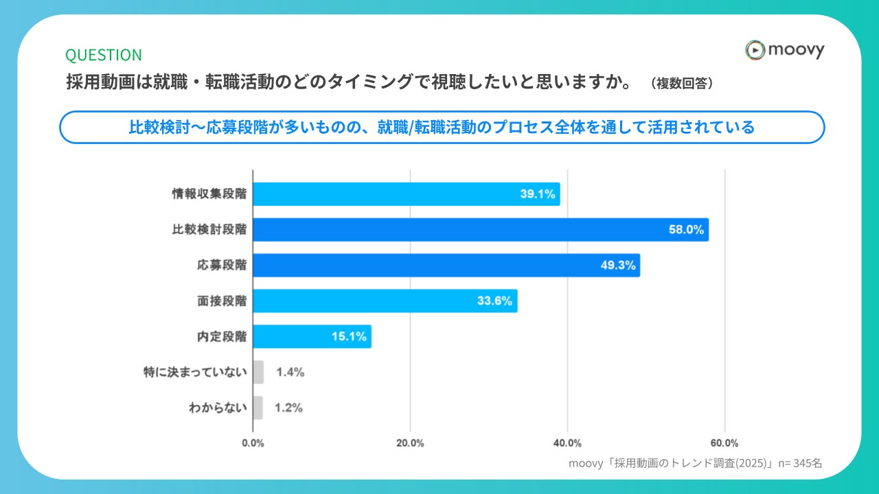 採用動画を視聴したタイミングについては、「比較検討段階(58.0%)」、「応募段階(49.3%)」が上位でした。
