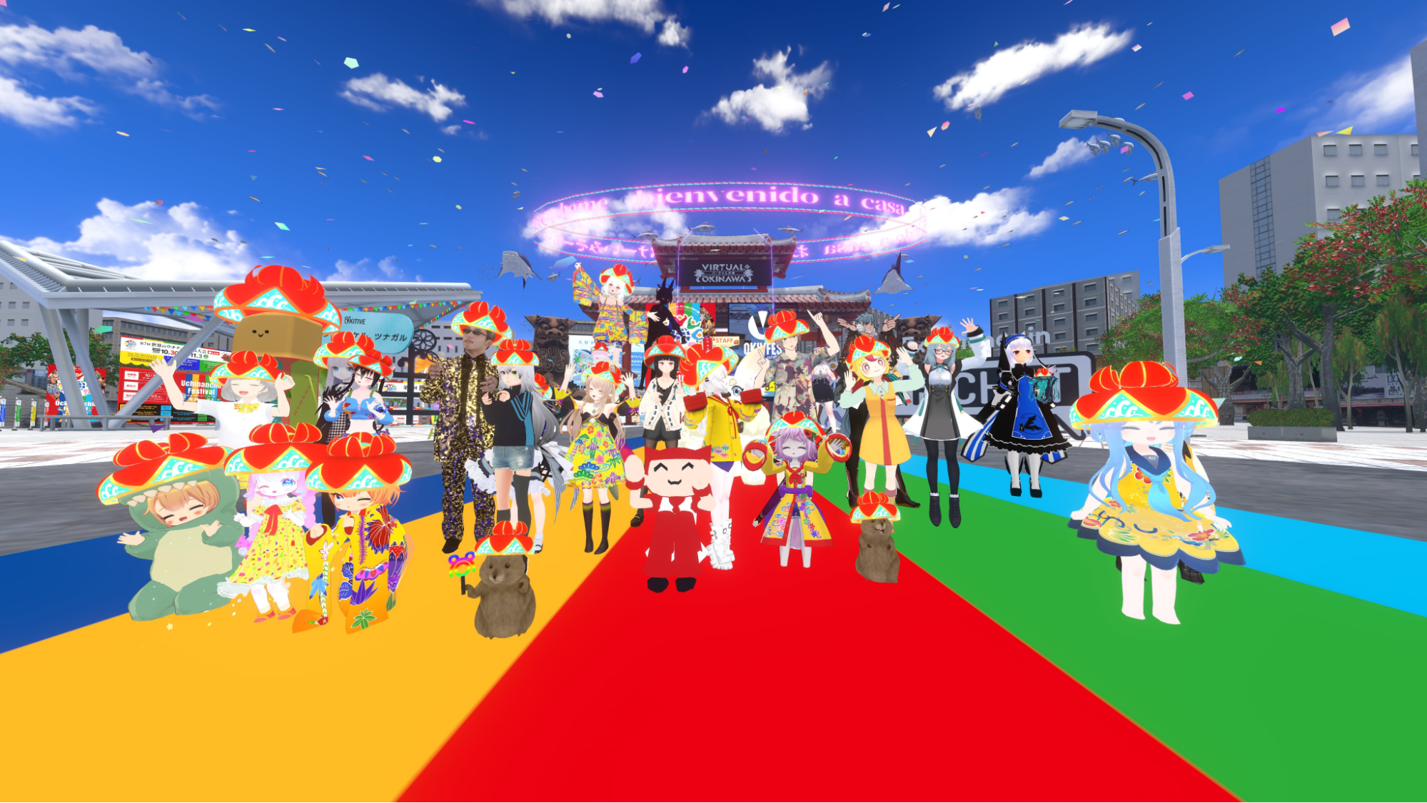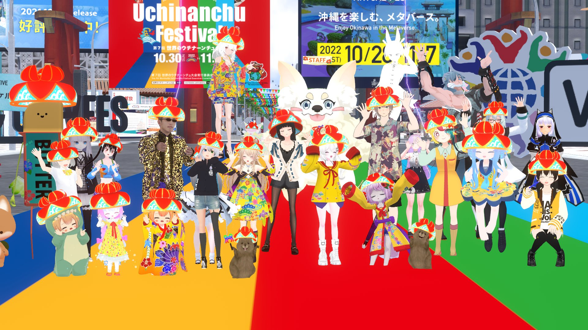 OKIVFESご参加の有志によって急遽開催されたのが、花笠集会です。OKIVFES期間中にVRChat参加者の間でアバターにかぶせる琉球花笠が流行。「花笠をかぶったアバターでOKIVFESの思い出を集合写真に残そう」という声かけが行われ、多くの方にお集まりいただきました。