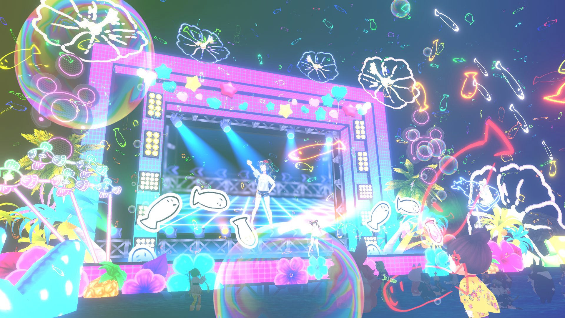 沖縄ならではの音楽から、最新シングルの「ぐるくんのうた」まで。バーチャル空間だからこそできる仕掛けいっぱいのライブ。バーチャルならではの場面転換を活かした豪華な演出や、近い距離感でのライブ体験に大変ご好評をいただき、ライブ配信中に「#ういばーす」がTwitterトレンド入りしました。