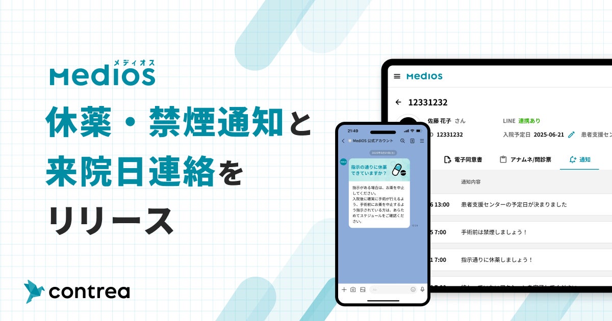 Contrea株式会社(本社:東京都新宿区、代表取締役CEO:川端一広、以下「コントレア」)は、患者説明動画サービス「MediOS(メディオス)」において、患者さんへの「休薬・禁煙通知」と「来院日連絡」の機能をリリースしたことをお知らせします。これにより、術前管理の効率化と患者さんへの連絡業務の負担軽減を実現します。