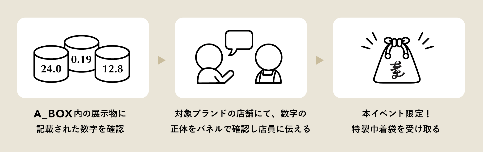 A_BOX内に記載されている「謎の数字」の意味を参加ブランドの店舗で確認することで、素敵なプレゼントがもらえるキャンペーンです。A_BOX内の展示に留まらず、素材にこだわってものづくりをしているブランドの店舗へ足を運ぶことで、日本橋のファッションの魅力をさらに深く体験することができます。こだわりの素材に触れることで、いつもと違う視点からファッションを楽しむことが可能です。