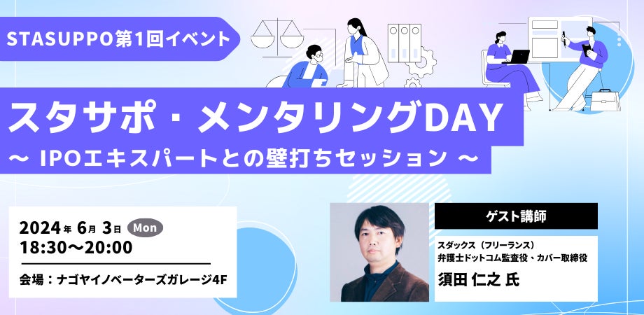 スタサポ・メンタリングDAYの第1回講師は、今回、名古屋地域のスタートアップ起業家を対象に、孫正義氏と共に数々の事業立ち上げからIPOまで関与し、さらに多くの企業のIPO成功を手掛けてきたスダックス 須田仁之氏(弁護士ドットコム株式会社 監査役 / カバー株式会社 取締役)をメンターに招き、特別なメンタリングイベントを開催します。