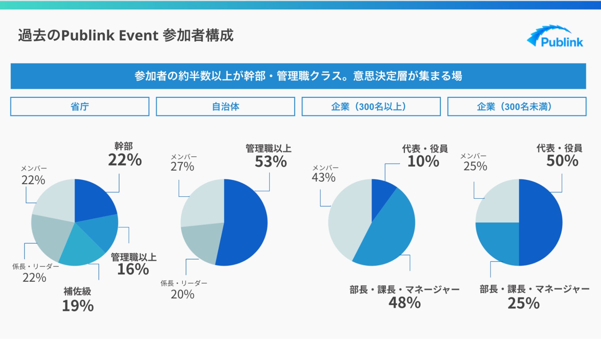 日本では急激に人口減少と超高齢化で課題が噴出し、解決に向けて新たなテクノロジーやビジネスモデル、制度やルールの社会的な実装が必要な局面を迎えています。そのような中、共通のビジョンのもと、シナジーをより高める官民・企業間の共創が不可欠な時代になっています。加えて、官と民を行き来する人材が増え始め、両者の垣根が低くなってきています。そこでPublinkは、AI時代だからこそ残る「人」に焦点を当て、日本の未来の産業・社会に向けて組織を越えた共創が当たり前になる新しいカルチャーを創出します。