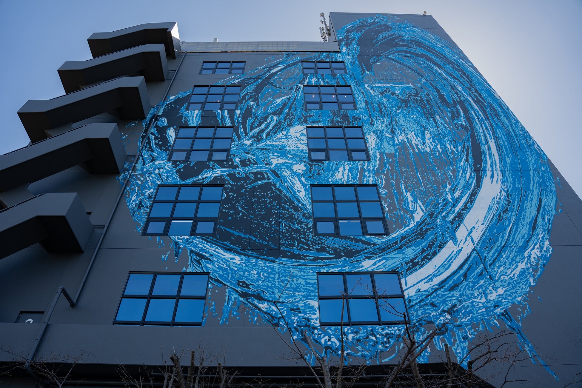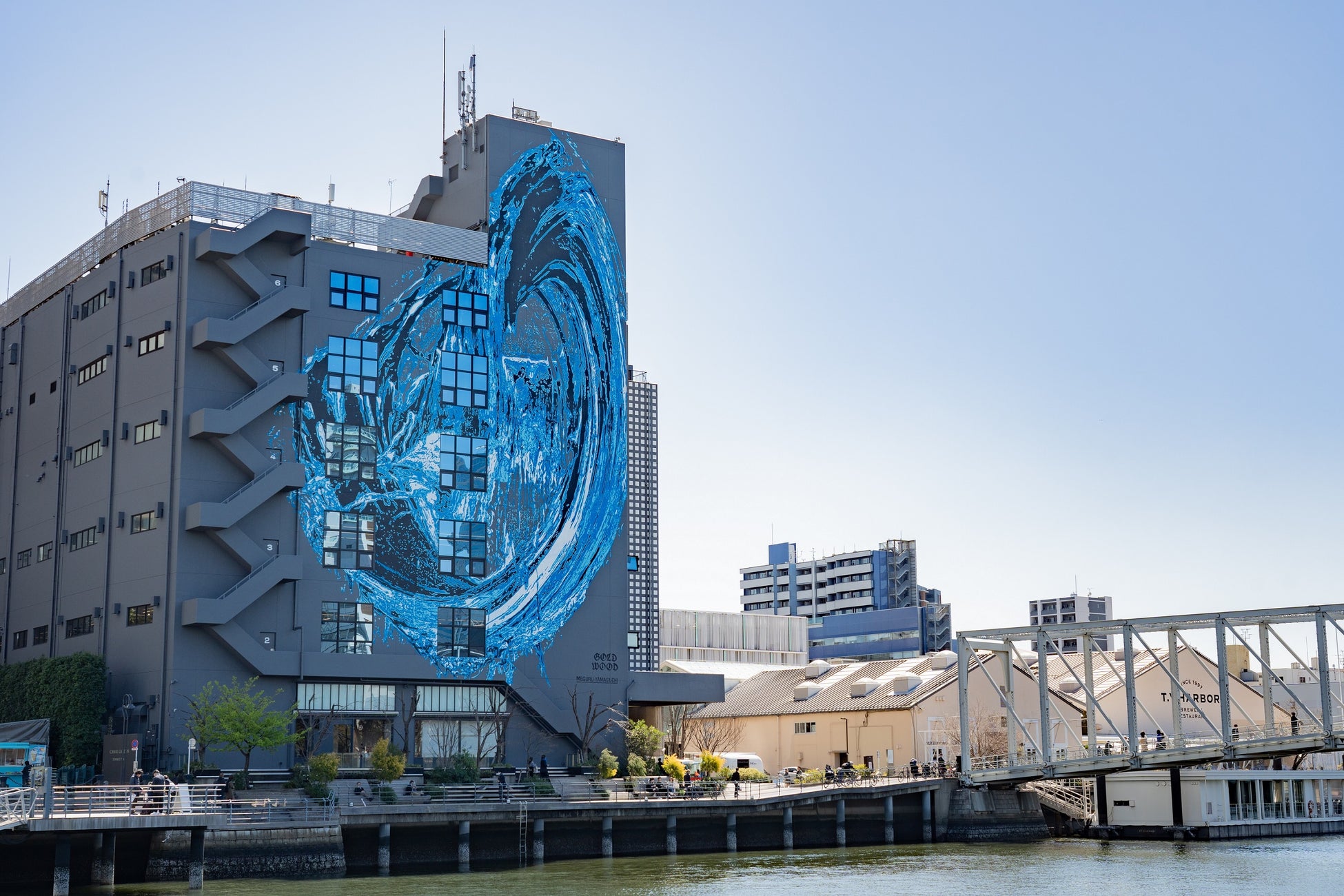 葛飾北斎の「龍図」を構図のモチーフに、黒・白・青・水色の4色によって描かれたブラシストロークが壁面を縦横無尽に飛翔するダイナミックな作品は、天王洲の玄関口でもある「ふれあい橋」横からも眺めることができ、「水辺とアートの街、天王洲」の新たな魅力として加わりました。当協会は本プロジェクトを通し、今後も天王洲の魅力あるまちづくりを創造し、世界へ発信できる文化観光地域づくりを行ってまいります。