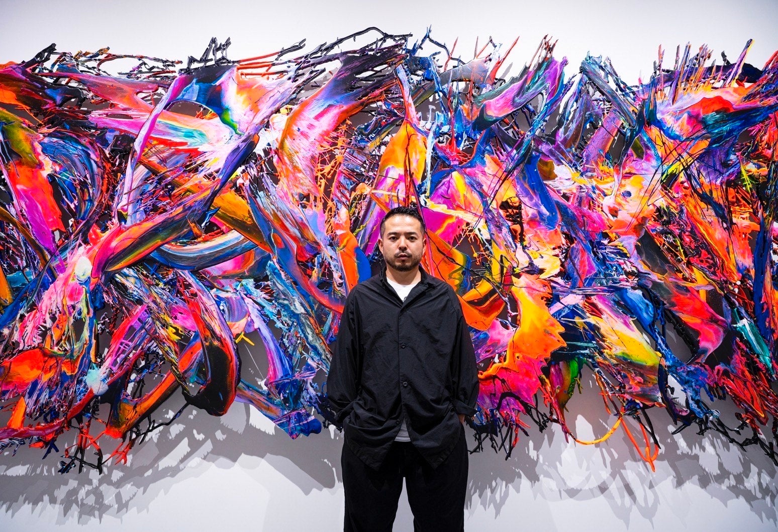 世界的に活躍する現代アーティスト山口歴が、高さ40m横22mの大型壁画に挑戦。北斎「龍図」をモチーフに、縦横無尽に山口のブラシストロークが飛翔