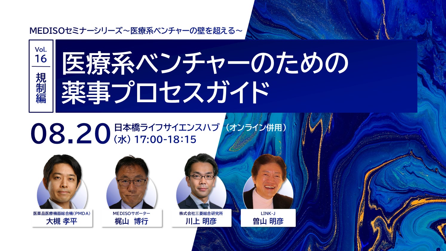 第16回MEDISOセミナーでは「薬事プロセス」をテーマとして取り上げ、PMDA ⼤槻様より、薬事プロセスを進める上でベンチャーが活⽤すべきRS戦略相談等のポイントについてご説明いただきます。 また、MEDISO常勤サポーターの梶⼭様、LINK-J 曽⼭様、MEDISO事務局も交えて、薬事プロセスやPMDA相談の望ましい進め⽅や、医療系ベンチャーが共通して躓くポイント等についてパネルディスカッションします。