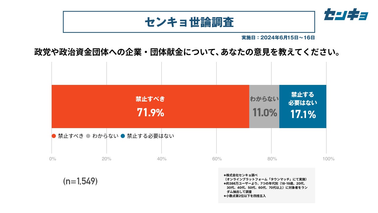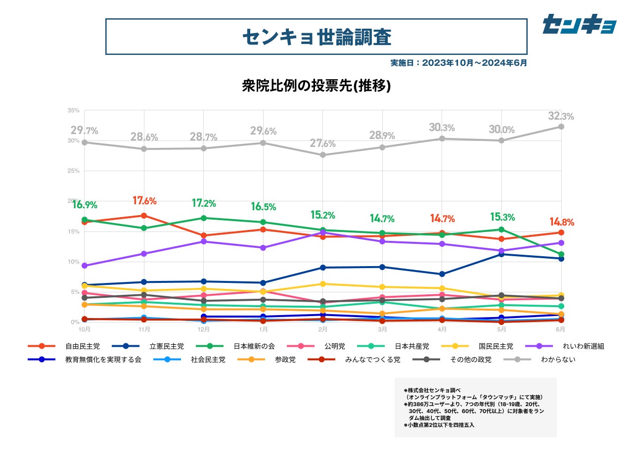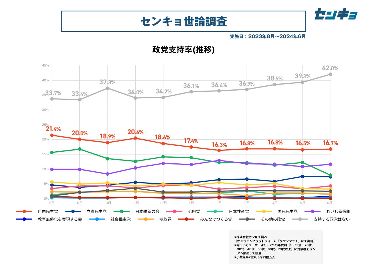 株式会社センキョ(所在地:東京都港区、代表取締役:堀 浩之)は、2023年8月より毎月、自社で運営する全国386万人余りの市民が参加するプラットフォーム「タウンマッチ」において、内閣の支持率や政党の支持率などを調査する「世論調査」を実施しています。政治に関する新たな調査データとして、政治関係者や有識者だけではなく、幅広く多くの方にご活用いただけますと幸いです。
